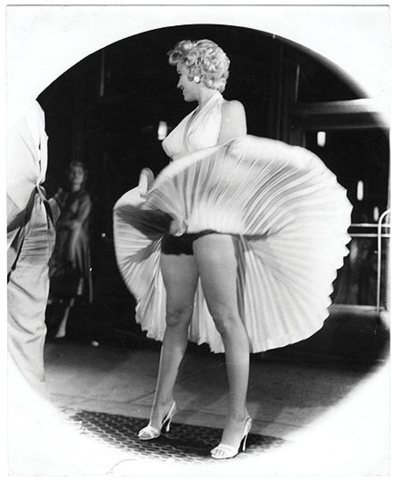 Co innego nogi MM! Te znane z najsłynniejszego kadru komedii zatytułowanej „Słomiany wdowiec”. Rok 1955, Marilyn staje na kracie wentylacyjnej metra; podmuch ciepłego powietrza unosi plisowaną spódniczkę jej sukienki wysoko, co pozwala podziwiać zgrabne łydki i ponętne uda, a nawet to, co powyżej… Aktorka wcale się nie peszy. Przeciwnie, z lubością powtarza scenę, igrając z niesforną spódniczką. Moment zauważa mało znany fotograf Arthur Felling, pseudo Weegee, Żyd galicyjski ze Złoczowa, amerykański emigrant od 1909 roku. Ten pionier fotoreportażu robi serię fotek, które obiegają świat. I oto rodzi się symbol seksu lat 50. – Marilyn Monroe w podwianej kiecce.