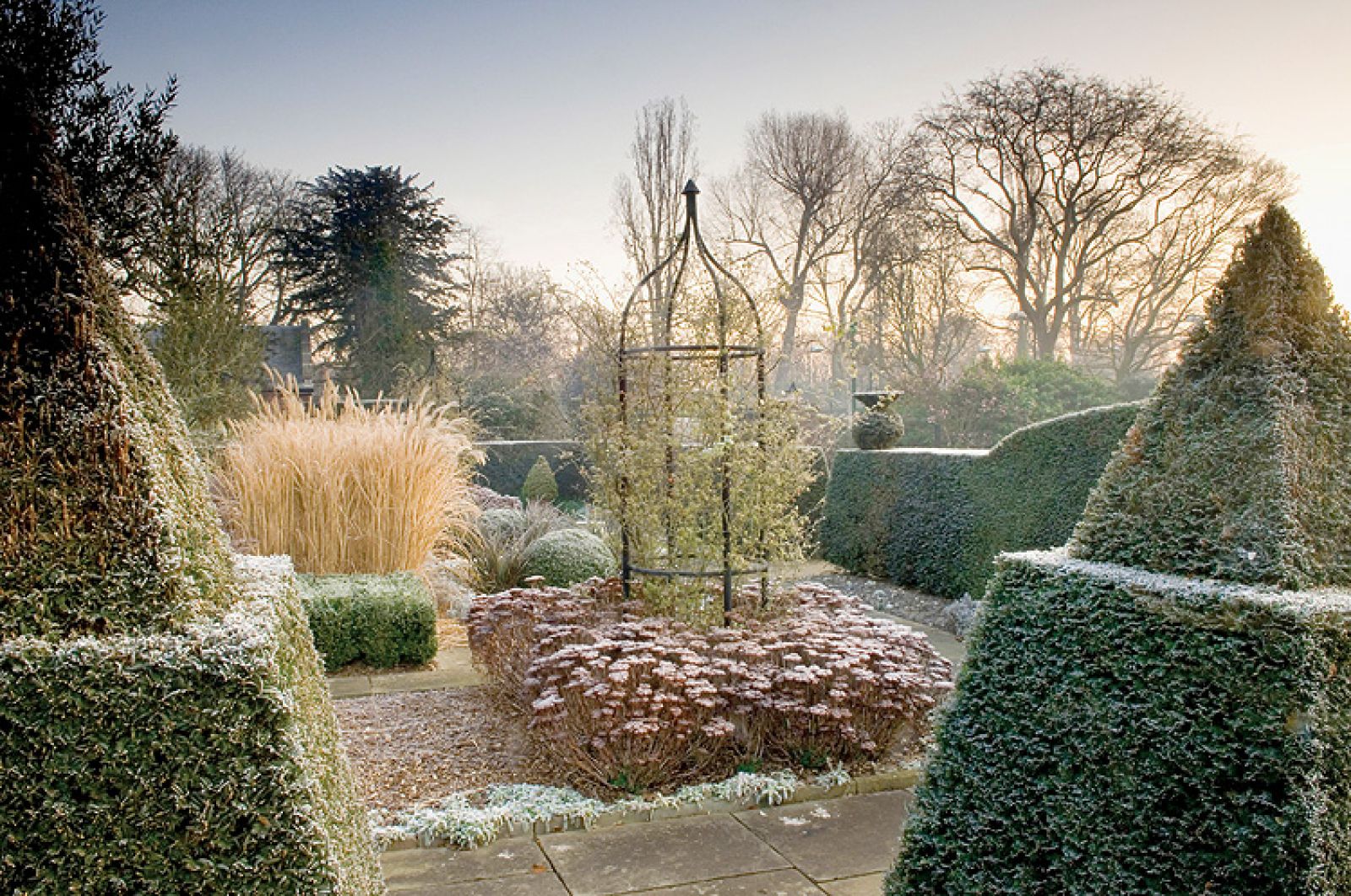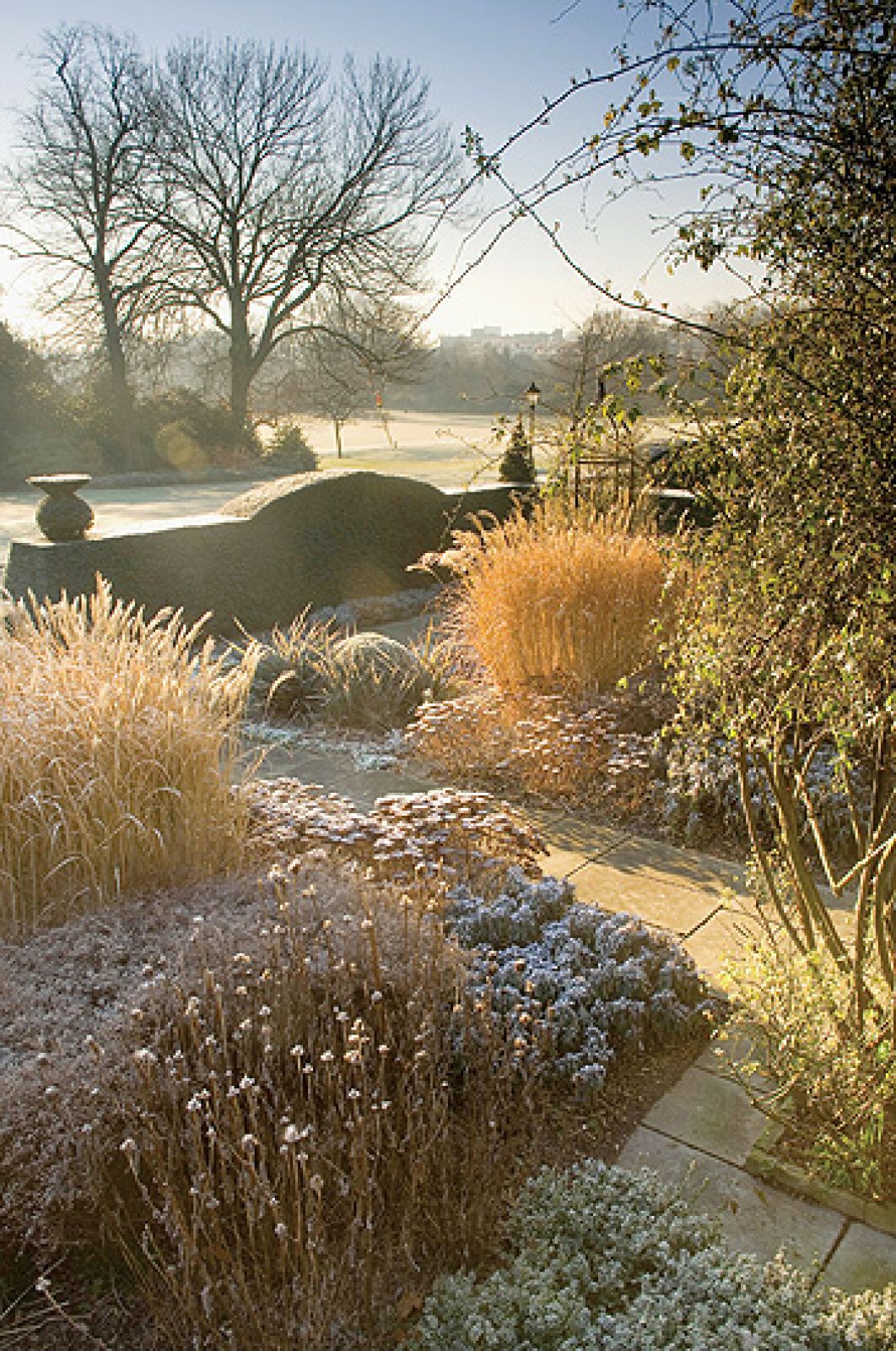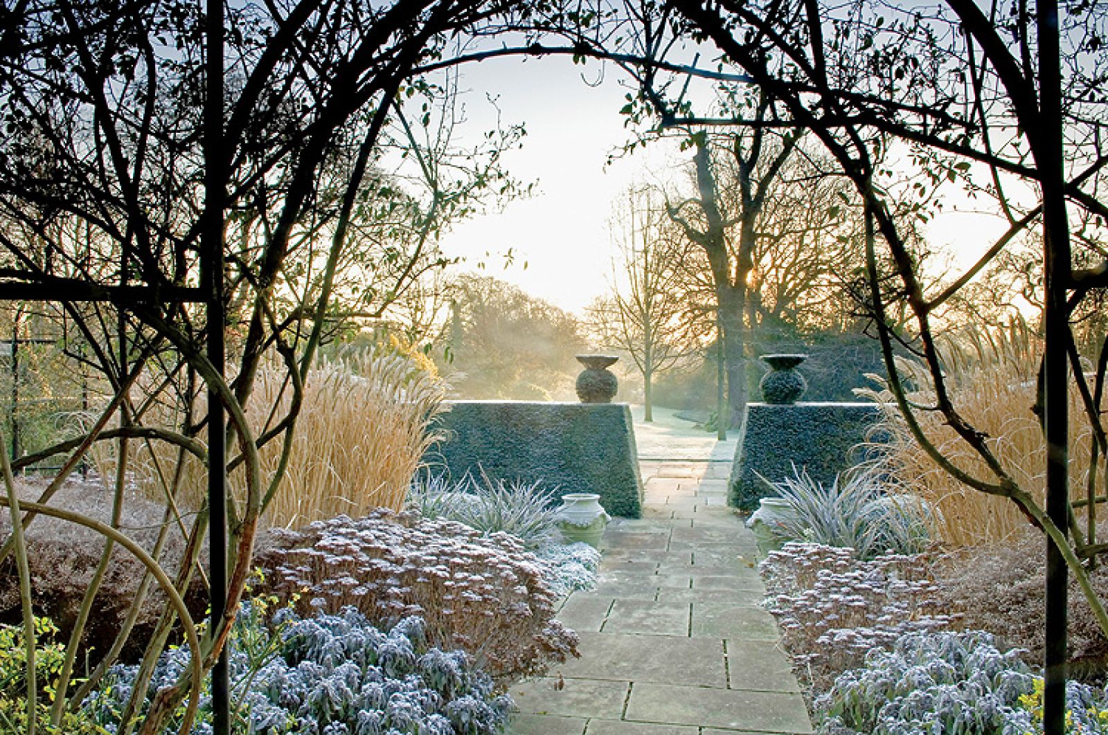 Zupełnie inaczej ogród wygląda zimą. Rośliny jednoroczne są specjalnie zostawiane w ziemi na czas mrozów, jeśli tylko, jak powiada ogrodnik, „umierają elegancko”, czyli zachowują ciekawe kształty po przekwitnięciu. – Zimą zmieniają się kolory i życie ustępuje miejsca mocnym cieniom rzucanym przez zimowe słońce i przytłumionym barwom przekwitniętych roślin wieloletnich – opowiada projektant. Jeżeli jeszcze do tego chwyci mróz i pojawi się szadź, ogród przeistacza się w prawdziwy cud natury.