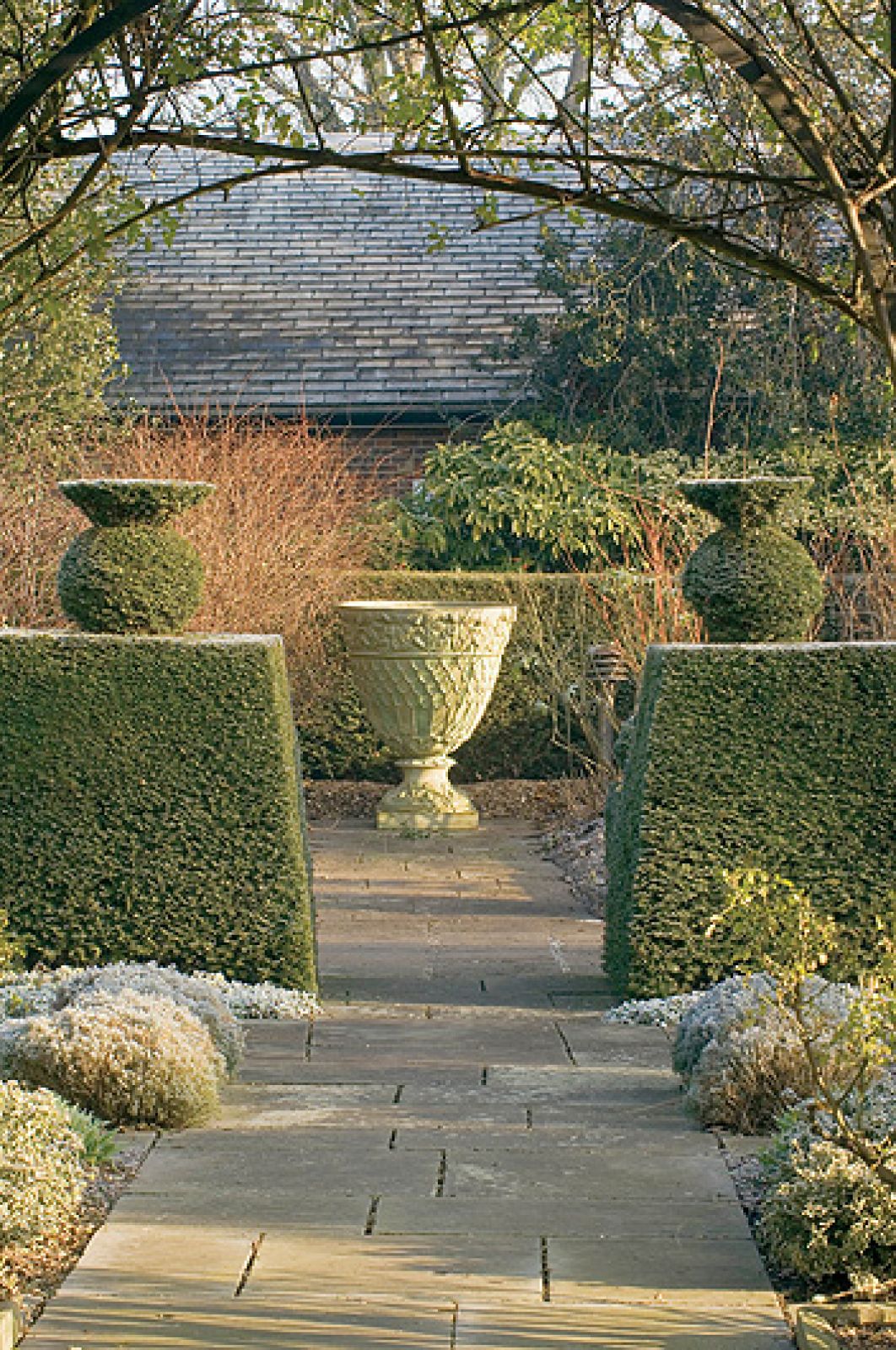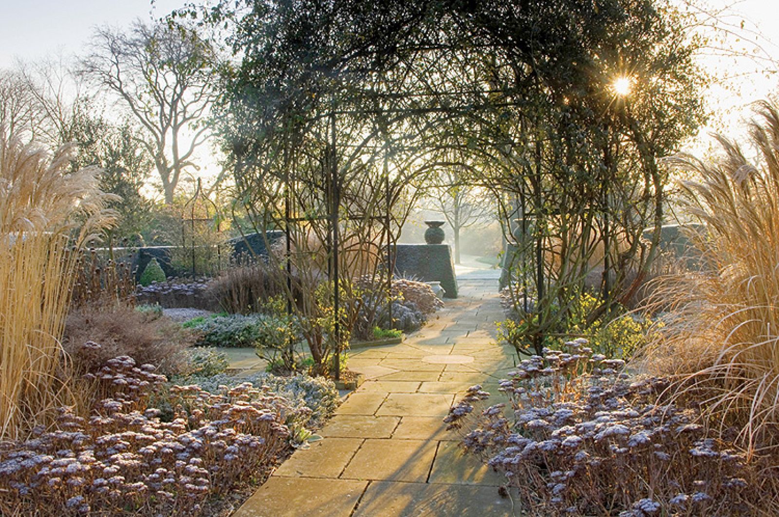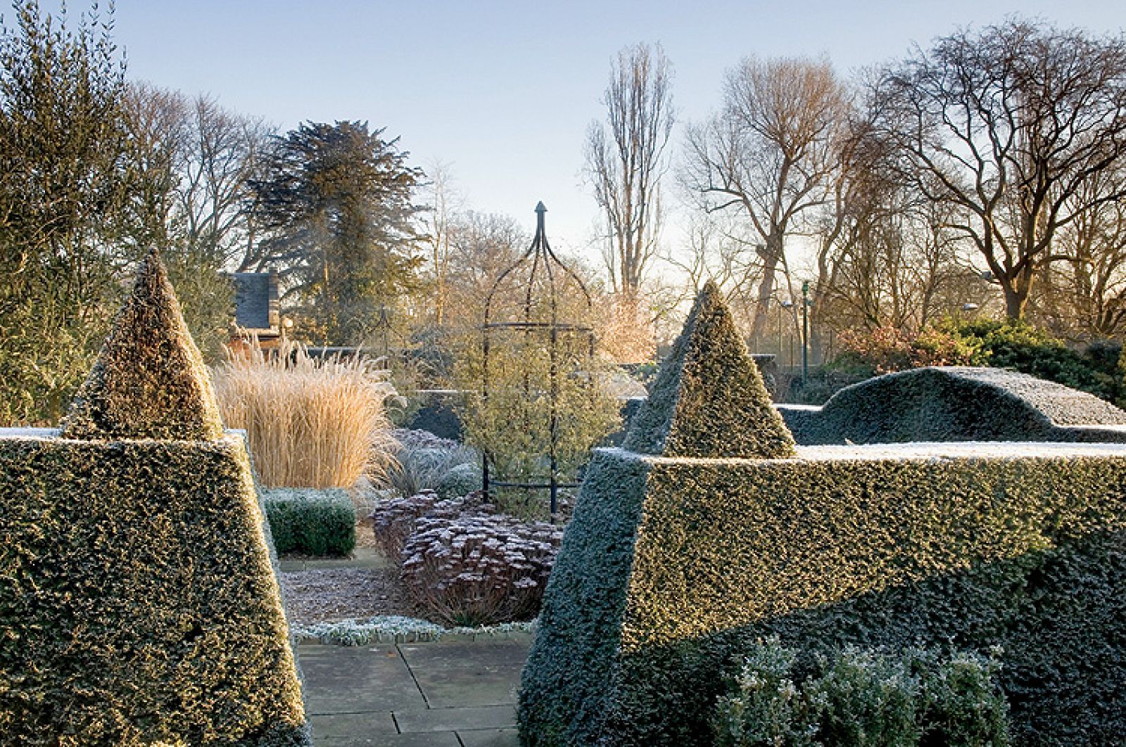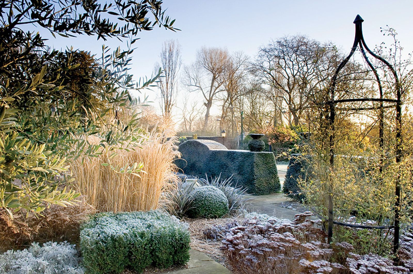 Zupełnie inaczej ogród wygląda zimą. Rośliny jednoroczne są specjalnie zostawiane w ziemi na czas mrozów, jeśli tylko, jak powiada ogrodnik, „umierają elegancko”, czyli zachowują ciekawe kształty po przekwitnięciu. – Zimą zmieniają się kolory i życie ustępuje miejsca mocnym cieniom rzucanym przez zimowe słońce i przytłumionym barwom przekwitniętych roślin wieloletnich – opowiada projektant. Jeżeli jeszcze do tego chwyci mróz i pojawi się szadź, ogród przeistacza się w prawdziwy cud natury.