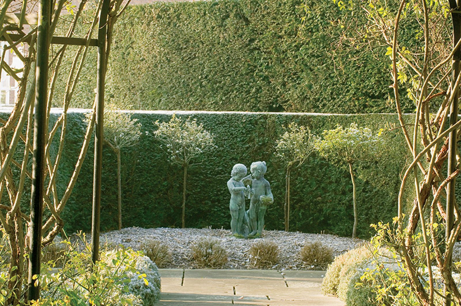 Dlatego zastąpił róże cisowymi żywopłotami, bukszpanami przystrzyżonymi w sześciany i drzewkami oliwnymi w kształcie kostek „na łodydze”. Znajdziemy tu również dwie odmiany trzmieliny Fortune’a. Układ ogrodu i wytyczone pośród różanych klombów ścieżki pozostały bez zmian.