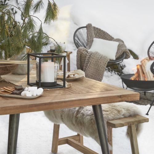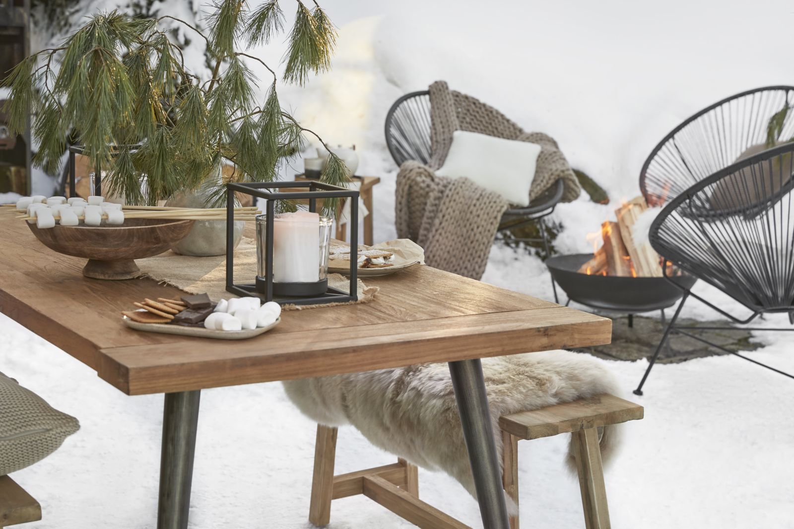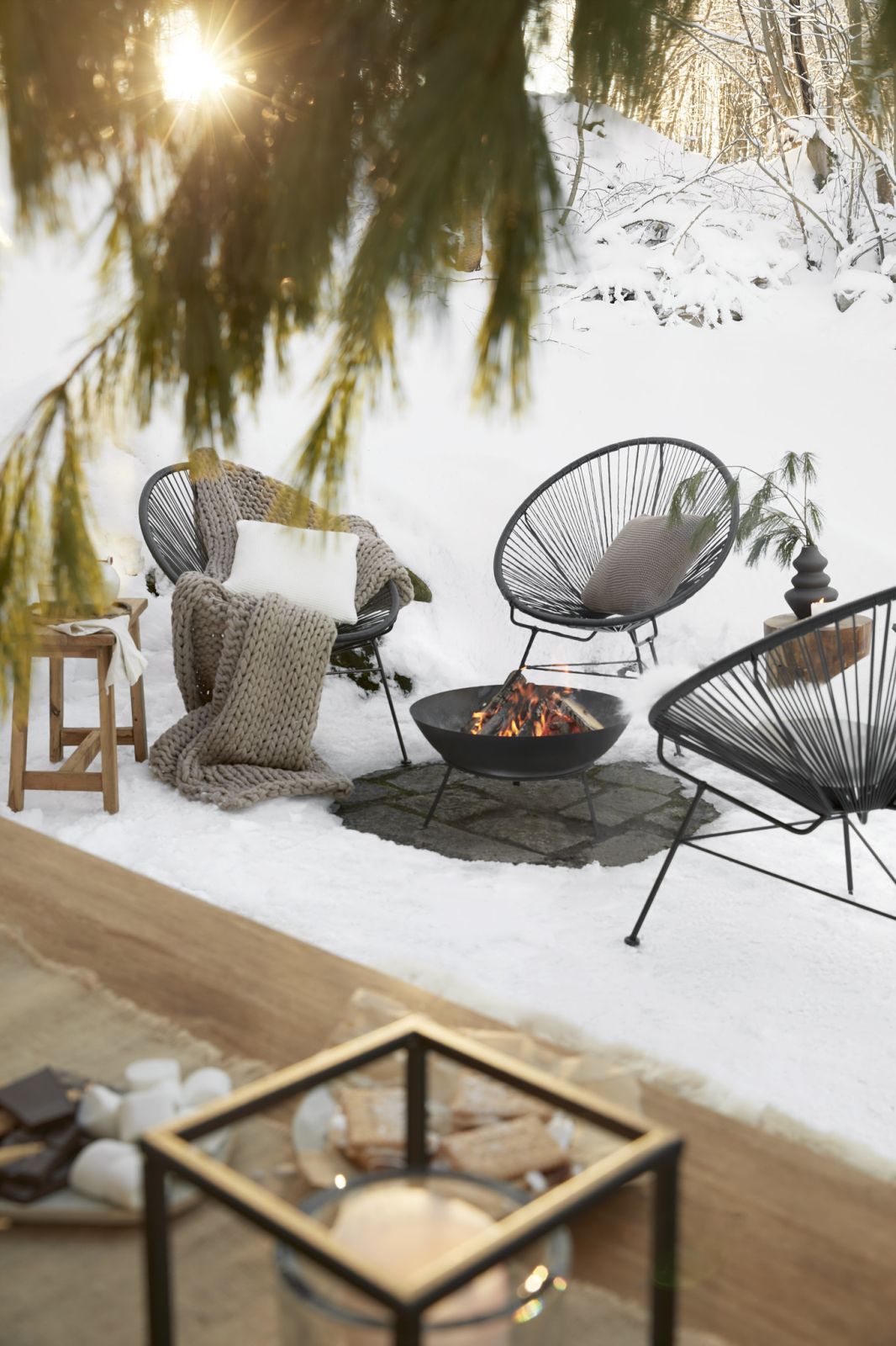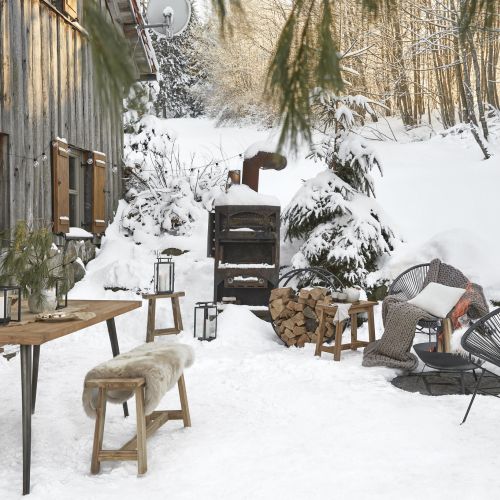 By nie chować ich za każdym razem, warto postawić na modele w całorocznych obleczkach, ze specjalnych, odpornych na mrozy i deszcz tkanin. Ale uwaga: nie będą tak miękkie i ciepłe jak grubo plecione wełenki. Może więc warto zdecydować się na naturalne materiały, delikatniejsze i milsze w dotyku, które rzeczywiście grzeją? W końcu zimą nie spędzamy na tarasie całego dnia, więc wyniesienie kilku poduch na krótki czas nie powinno sprawić kłopotu. No i coś do okrycia – zadbajmy o swój komfort termiczny – pledy, koce, narzutki, sztuczne futerka i kożuszki. Uwijmy sobie na tarasie ciepłe zimowe gniazdko.
