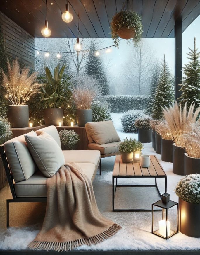 Piękny zimowy ogród na tarasie – doskonałe miejsce dla roślin