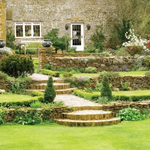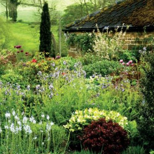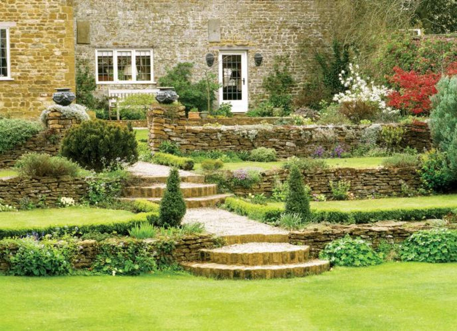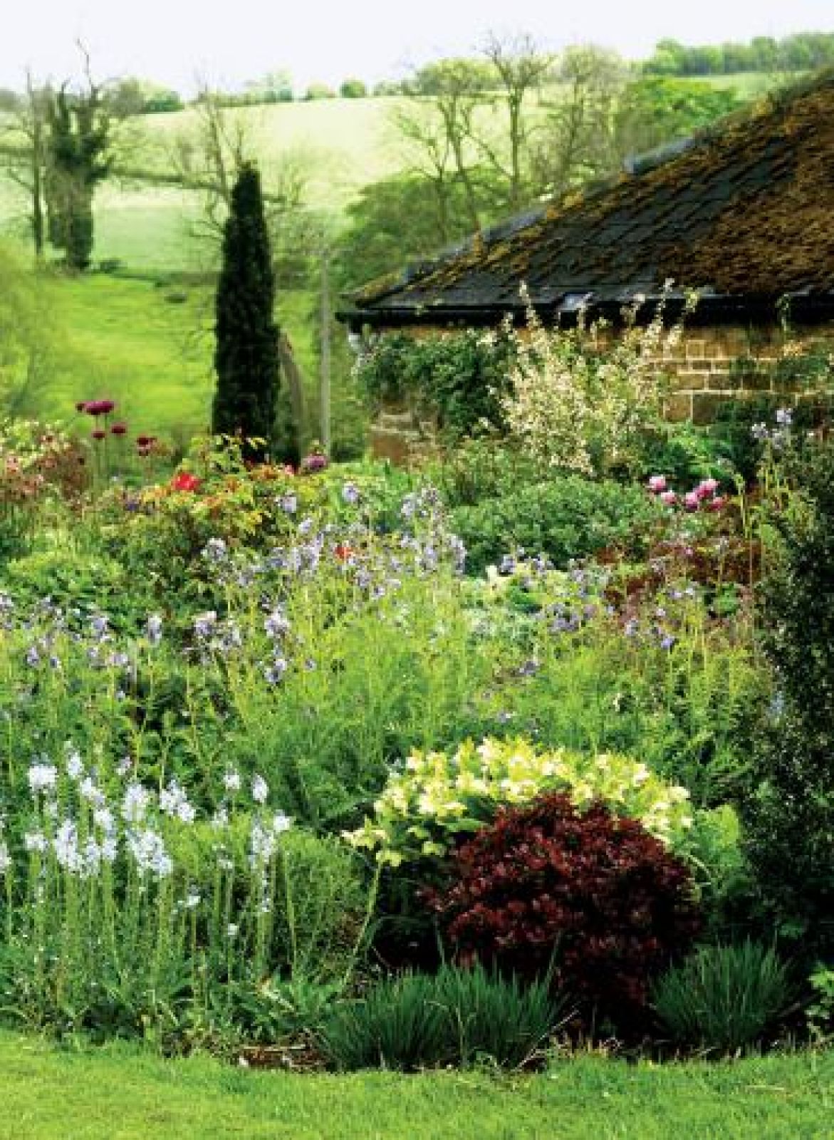 Ogród w naturalny sposób łączy się z otaczającymi go polami i wzgórzami. Wychodząc z domu, widzimy zaledwie niewielką jego część z wypielęgnowanymi roślinami. Dopiero gdy miniemy trawnik porośnięty krzewami i zejdziemy po kamiennych schodach, zaczyna się zupełnie inny świat – pieczołowicie zaplanowane grządki sąsiadują z ukwieconą łąką.
