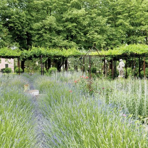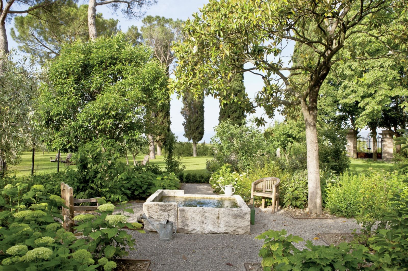 Kilka kroków i już jesteśmy w najcichszym i najbardziej zielonym zakątku. Pośrodku na trawniku otoczonym bukszpanowym żywopłotem rośnie kwitnący na pomarańczowo granatowiec. Wreszcie, otoczone oślepiającym błękitem lawendy i perowskii ‘Blue Spire’, kwitną róże. W tle trawy, morskie sosny i cyprysy. Ogród jest częścią ogromnego gospodarstwa – wokół są pola z ziołami i sady pełne antycznych jabłek i gruszek (niektóre pochodzą z Archeologia Arborea, kolekcji utworzonej w Città di Castello przez Livia Dallę Ragione i jego córkę Isabellę, pasjonatów ratujących tradycyjne odmiany drzew owocowych). Nie jest nawet ogrodzony, trawiasta ścieżka poprowadzi nas hen na pola, a dalej obrośniętą cyprysami drogą w stronę gór.