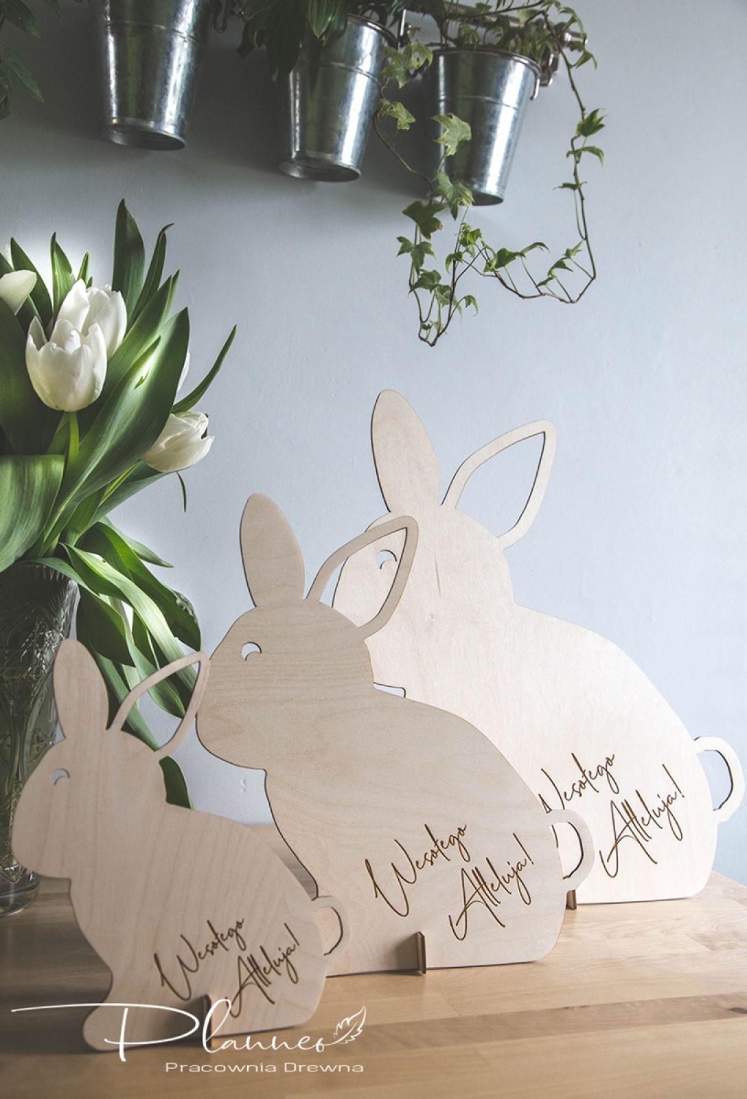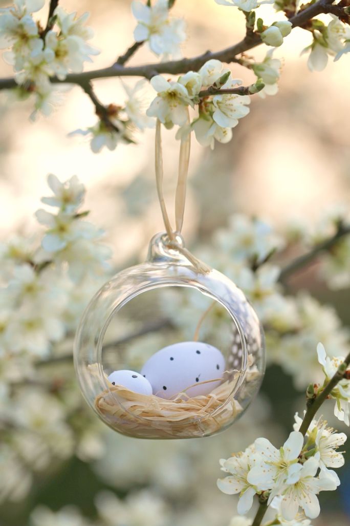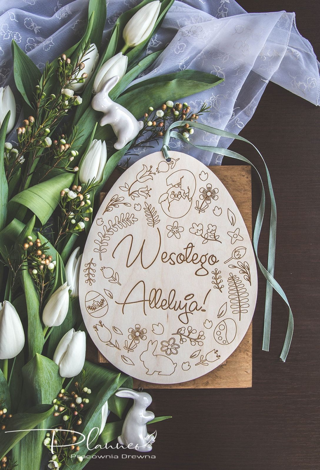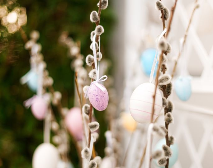 Wielkanocnymi akcentami będą świąteczne zawieszki na drzwi. Możecie kupić gotowe ozdoby lub wykonać samodzielnie. Udekorujcie szklaną bombkę władając do niej jajeczka, zajączki, piórka, koronki albo pomalujcie farbkami kartonowe lub styropianowe jajka. Może pomogą w tym dzieci? One mają jeszcze więcej ciekawych pomysłów. Zawieście dekoracje na aksamitnych wstążeczkach.