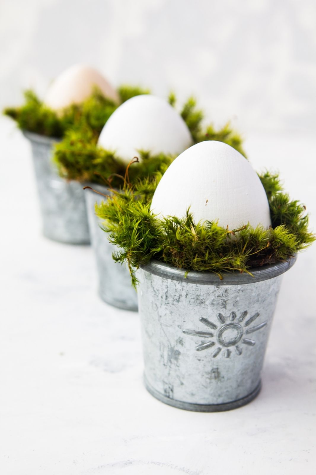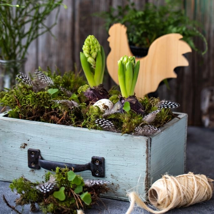 Będziecie potrzebowali ceramicznych doniczek albo wiklinowych koszyków – prostych i wysokich. Mogą być białe lub kolorze naturalnym. Wypełnijcie je mchem i kwiatowymi kompozycjami, np. z hiacyntami, tulipanami, szafirkami, żonkilami lub forsycjami. Takie piękne, wiosenne ozdoby możecie postawić przy drzwiach, na parapecie, przy wejściu do ogrodu albo na balkonie.