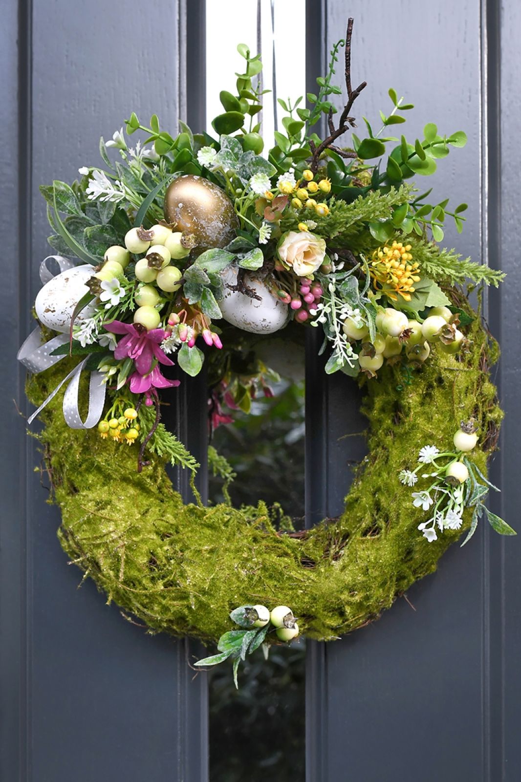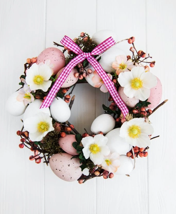 Jako dekoracje wielkanocne świetnie sprawdzą się klasyczne wianki, które powiesicie na drzwiach wejściowych. W sklepach internetowych kupicie witki wiklinowe. Sami możecie z nich skręcić wieniec dowolnej wielkości. Możecie kupić też gotowy stoik wielkanocny. Dobrze będzie wyglądał np. wiosenny wianuszek w kształcie serca. Udekorujecie go np. bukszpanem, baziami, kolorowymi jajeczkami.