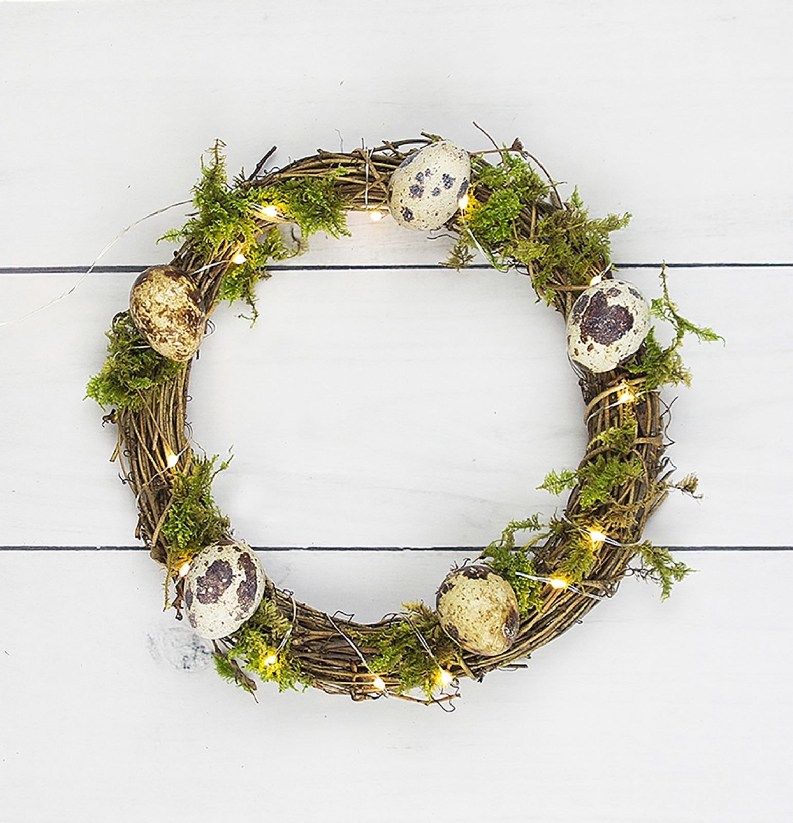 Wielkanocne wianki możecie też zrobić samodzielnie z gałązek bukszpanu. Bukszpan jest stosunkowo trwały, więc taka ozdoba będzie trwała. Aby ją dodatkowo wzmocnić użyjcie drucików florystycznych. Wieniec możecie ozdobić na przykład kokardą, piórkami: białymi lub kolorowymi, jajeczkami albo połówkami skorupki jajka. Do mocowania ozdób użyjcie drucika, sznurka albo kolorowej tasiemki.