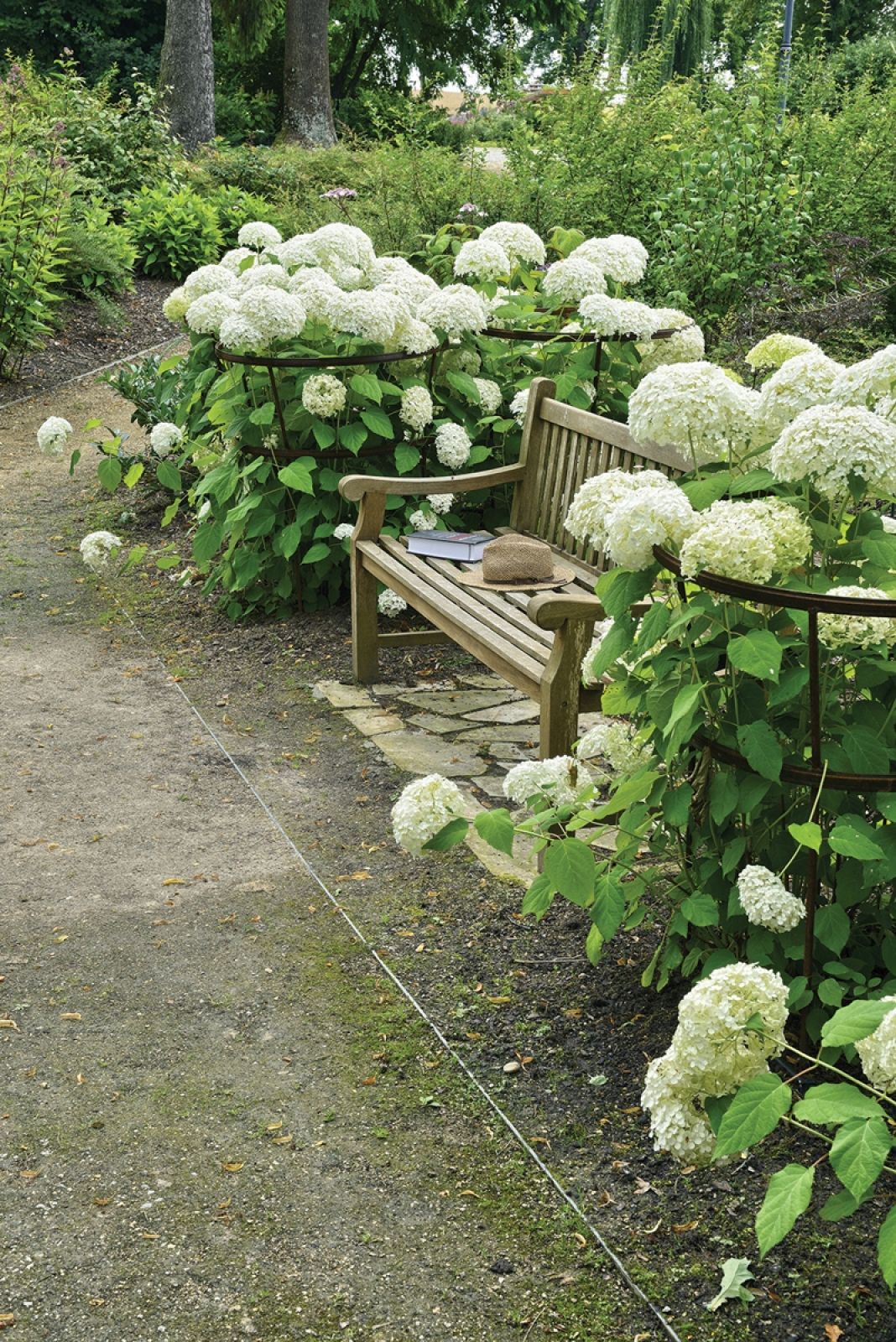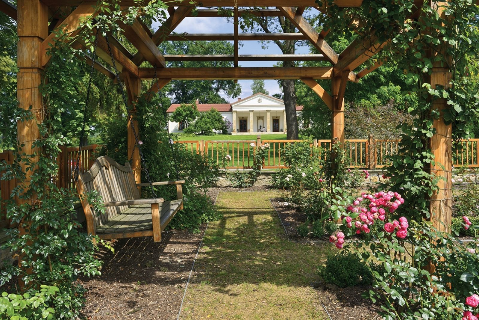 Na czterech hektarach terenu wokół dworu pan Tomasz zaprojektował też małą architekturę. Częściowo wpisała się w nieistniejące już zabudowania folwarczne. Tak było z nietypową pergolą — odpowiada ona długości dawnego budynku folwarku. Drewniana konstrukcja tworzy spektakularny tunel, który z wolna obrastają glicynie, powojniki, winorośl i róże. Projektant zadbał o osie widokowe i o to, by typowe dla naturalistycznego, angielskiego parku krajobrazowego drzewa soliterowe, czyli pojedyncze samotne okazy, wciąż cieszyły oko i żeby nic ich nie zasłaniało.