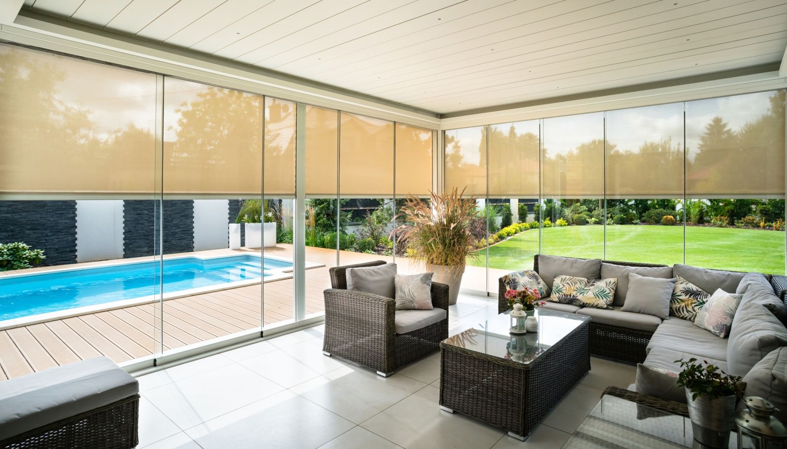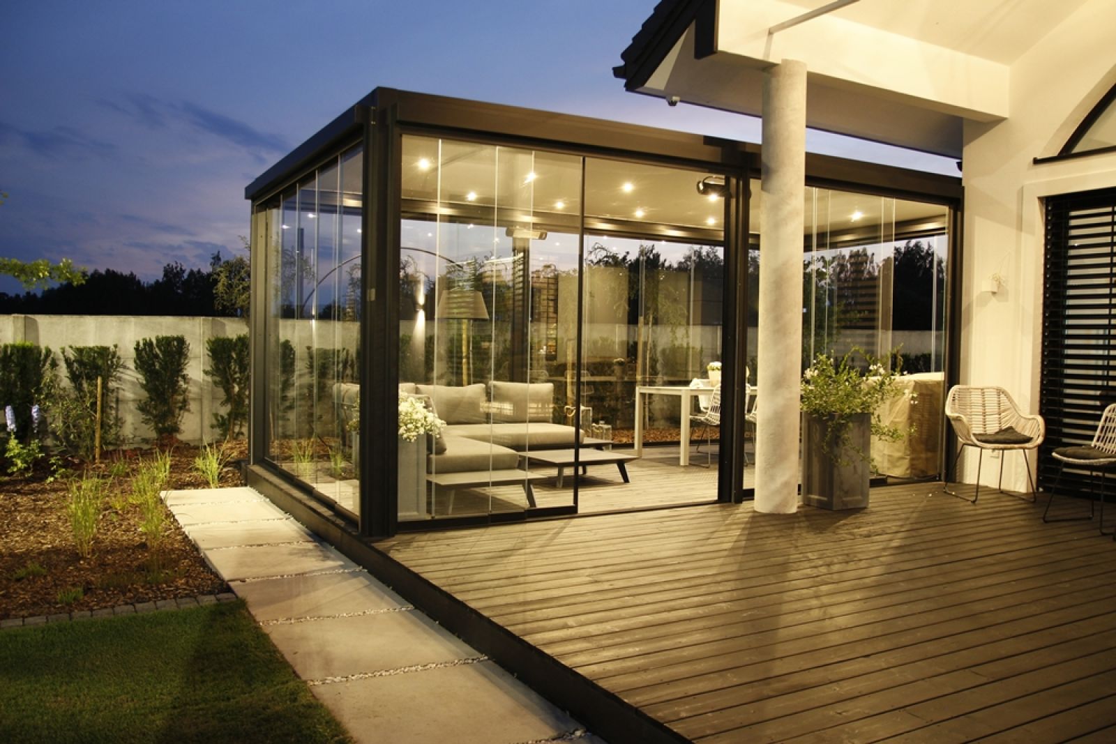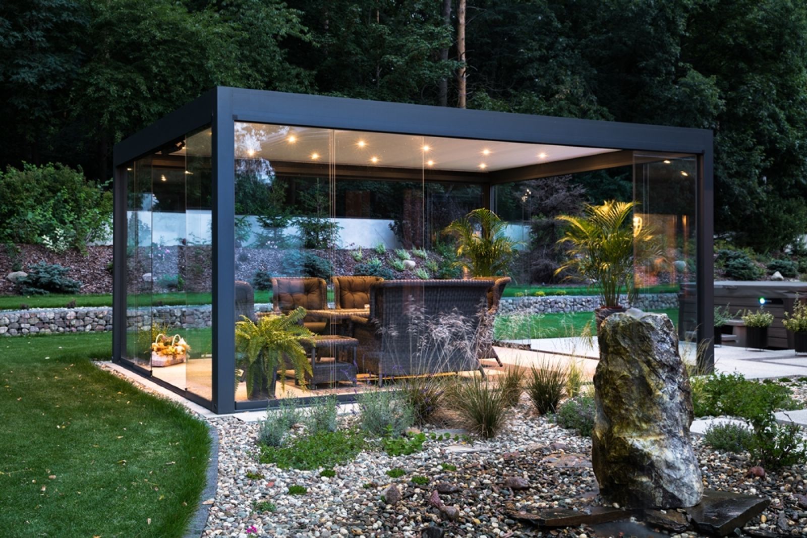 Dodatkowymi elementami wyposażenia są rolety boczne, czyli screenery. Stanowią ochronę nie tylko przed chłodnym powietrzem, natrętnymi owadami, ale także chronią naszą prywatność przed spojrzeniami sąsiadów, tym samym umożliwiając swobodę i spędzanie długich letnich wieczorów w pięknym otoczeniu kwitnącego ogrodu. Jeśli chcemy się osłonić od warunków atmosferycznych, ale zachować widoki, najlepszym rozwiązaniem będą przesuwne, szklane panele.