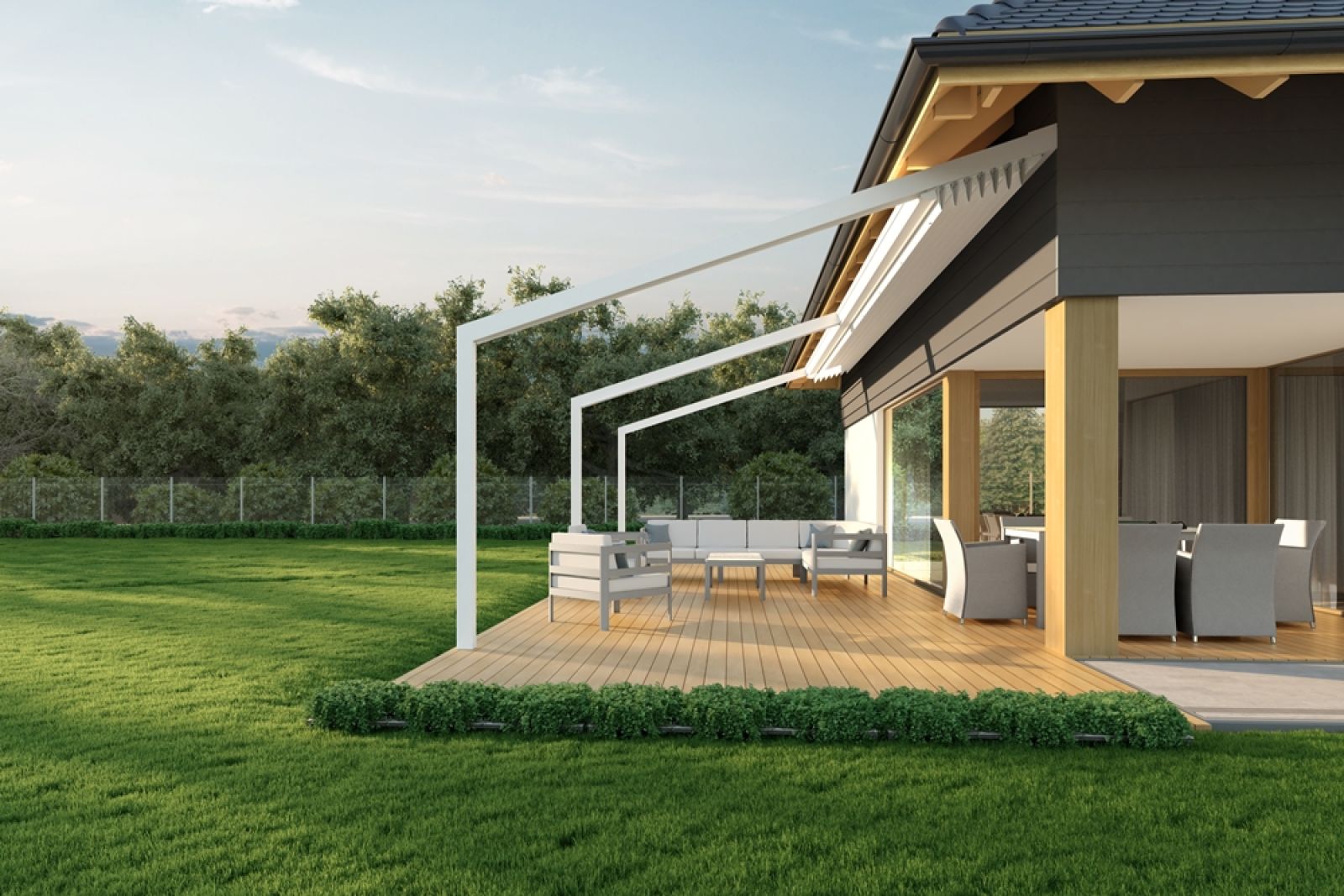 Zadaszenie, oprócz walorów estetycznych, ma wiele zalet użytkowych m.in. chroni przed słońcem, wiatrem oraz deszczem. Nowoczesny, wytrzymały materiał wykorzystany do przykrycia dachu umożliwia łatwą konserwację i nie nagrzewa się nawet w najbardziej słoneczne dni, a do jego wyczyszczenia wystarczy nam wilgotna ściereczka. Starannie dobrane elementy dodatkowe sprawią, że nasz taras będzie funkcjonował od wczesnej wiosny do późnej jesieni.