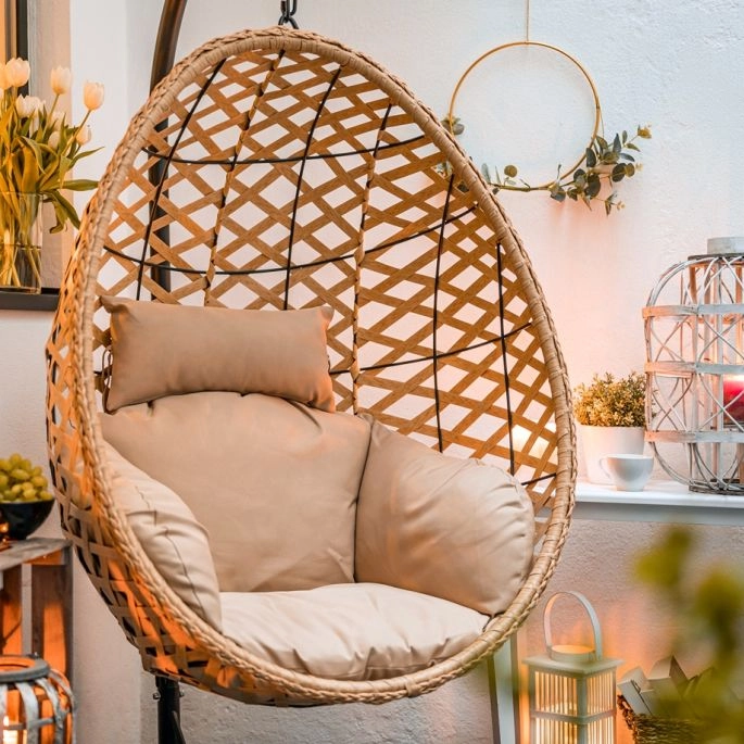Jeśli balkon jest bardzo wąski i nie ma miejsca na stolik z krzesłami, ani nawet na nieduży zestaw mebli ogrodowych, możemy na nim postawić pomysłową ławkę z wbudowanym składanym ministolikiem (wysuwa się go tylko w razie potrzeby). Jeśli chodzi o wybór fotela, warto postawić na wersję podwieszaną – siedzisko wisi na specjalnej stabilnej bazie. Nie mamy wtedy czterech dodatkowych nóg na małym balkonie, tylko wolną przestrzeń, a przy okazji możemy się relaksować, delikatnie bujając się na takim fotelu.