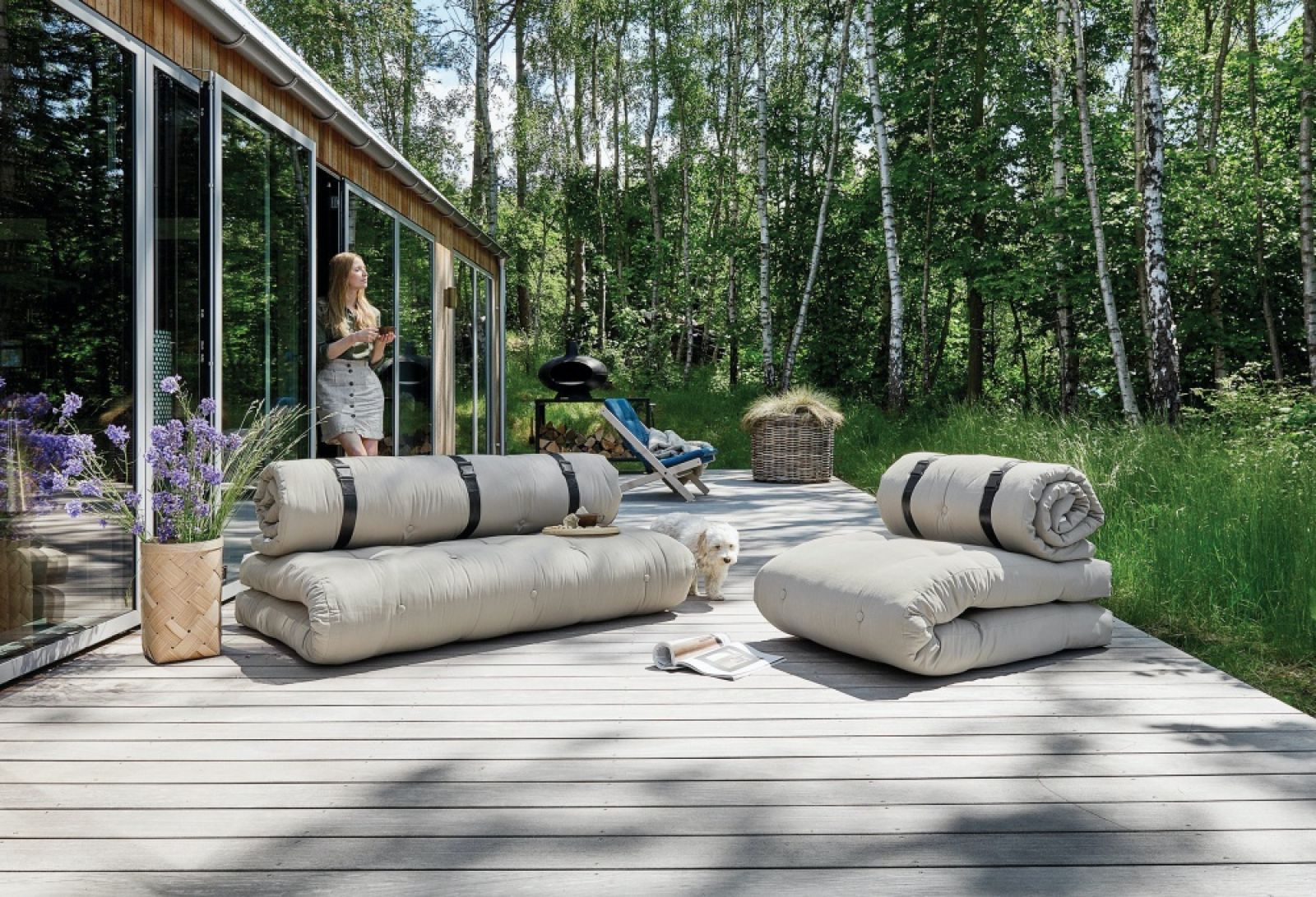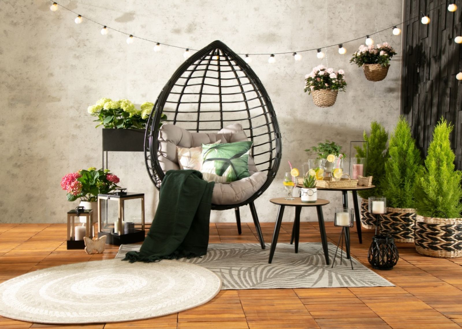 Nawet jeśli dysponujesz dużą przestrzenią balkonową, lepiej zastąp ciężkie drewniane meble optycznie lżejszymi, np. z naturalnego bambusa czy rattanowej plecionki. Idealne też będą wygodne leżaki, nieduże pufy i siedziska, poduchy podłogowe – można szybko je wnieść do salonu, kiedy psuje się pogoda i wyprać, gdy się zabrudzą. Pomyśl również o zakupie wiszącego fotela czy huśtawki, które stworzą przytulne kąciki do relaksu. Na dużym balkonie sprawdzi się fotel wiszący typu kokon, na mniejszym nieduży hamak, który można łatwo zdjąć.