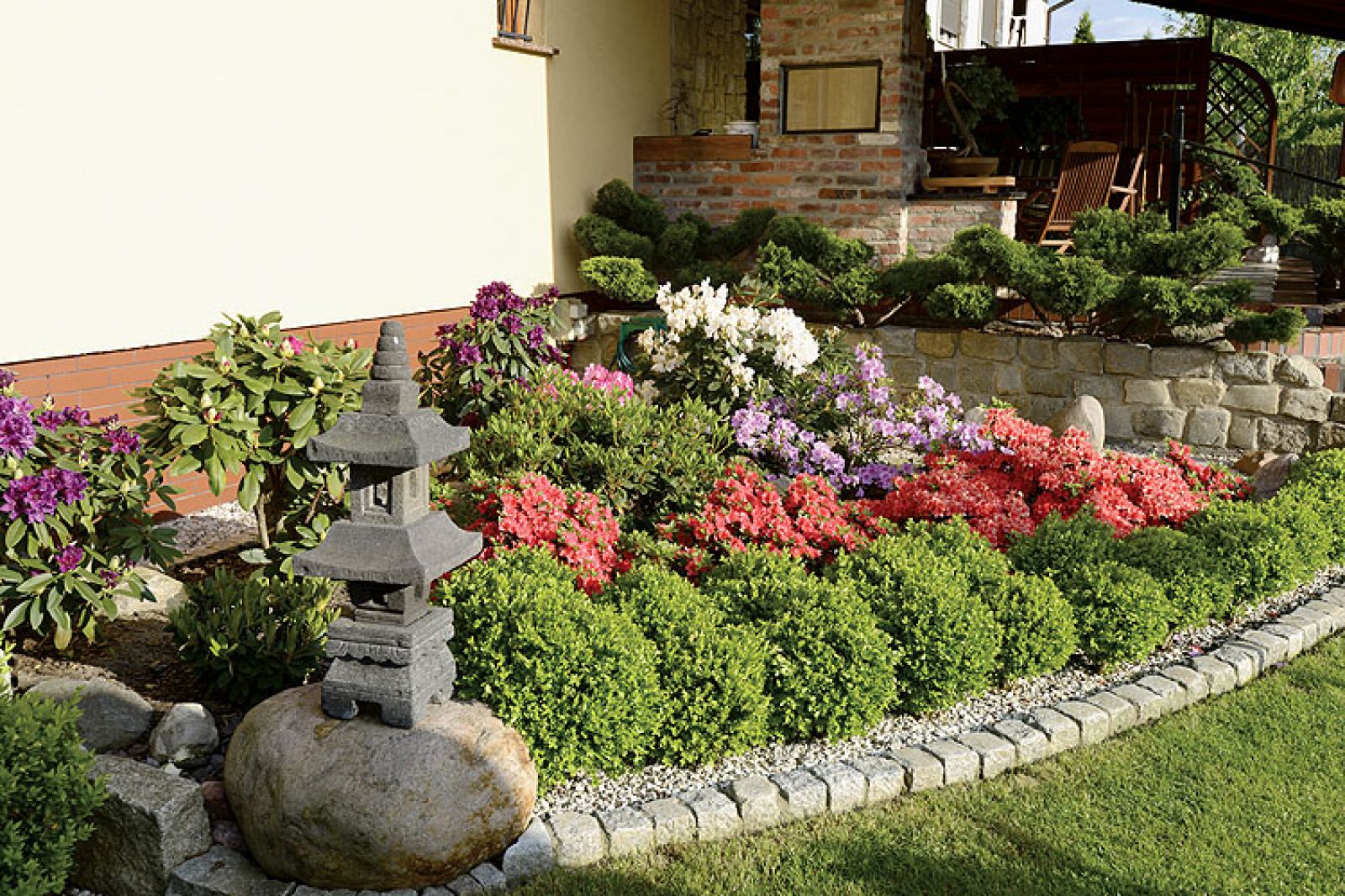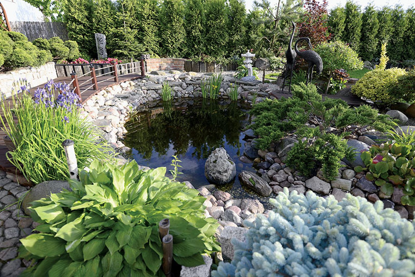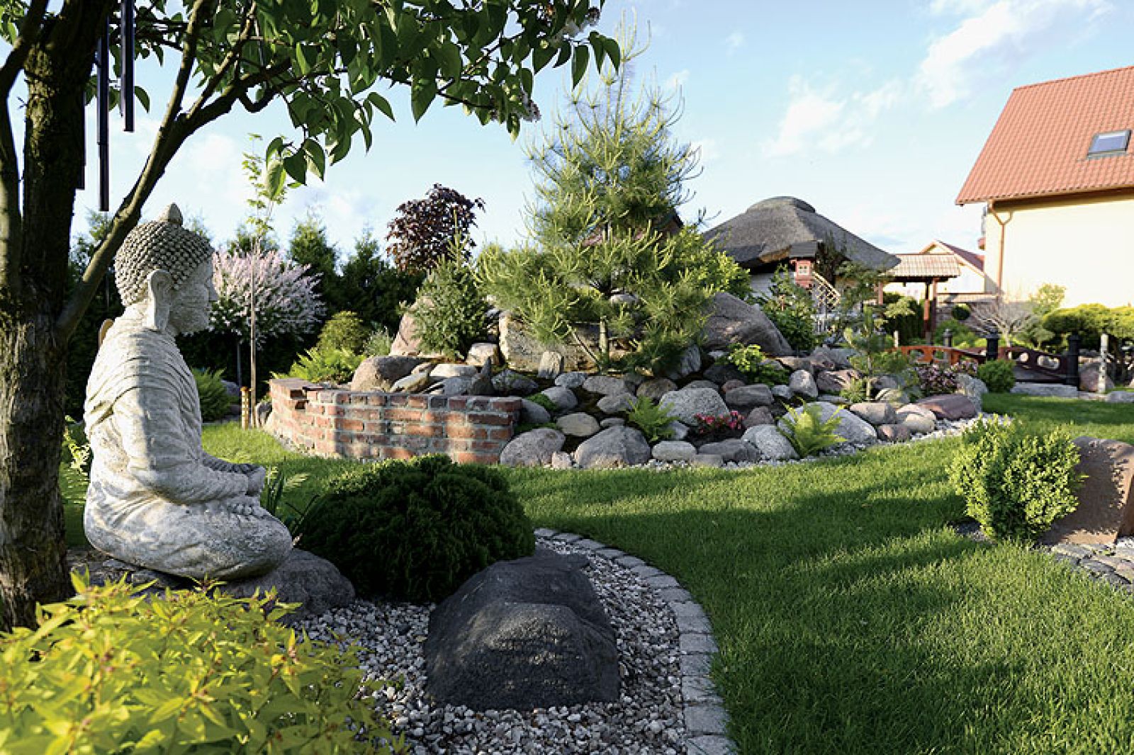 Jak to w japońskim ogrodzie – najpierw rzucają się w oczy głazy. Waldemar kupował je od właścicieli okolicznych pól albo dostawał od znajomych, którym za nic nie pasowały na działce. Wśród drzew najwięcej jest sosen, jeden buk, a wkrótce pojawią się klony japońskie. Nie zabrakło oczywiście rododendronów i azalii we wszystkich odcieniach różu, kilku krzewów hortensji i irysów. Kwiatów jest jednak mało, znacznie więcej jałowców, bukszpanów, funkii i traw.
