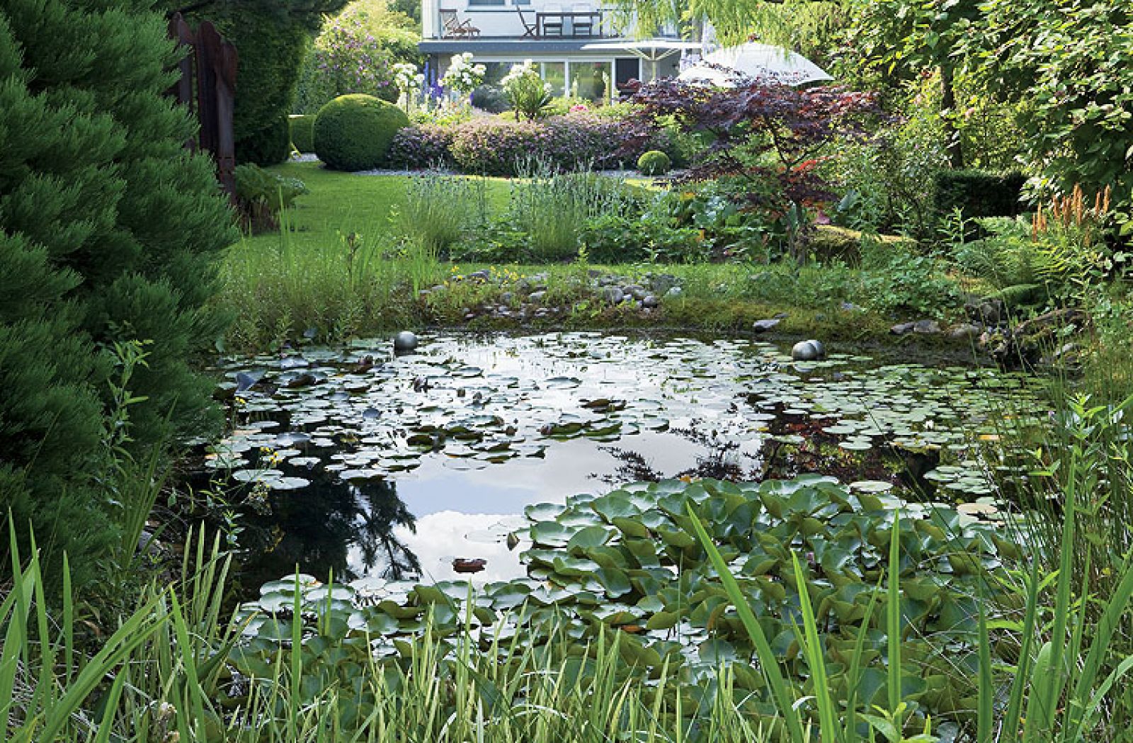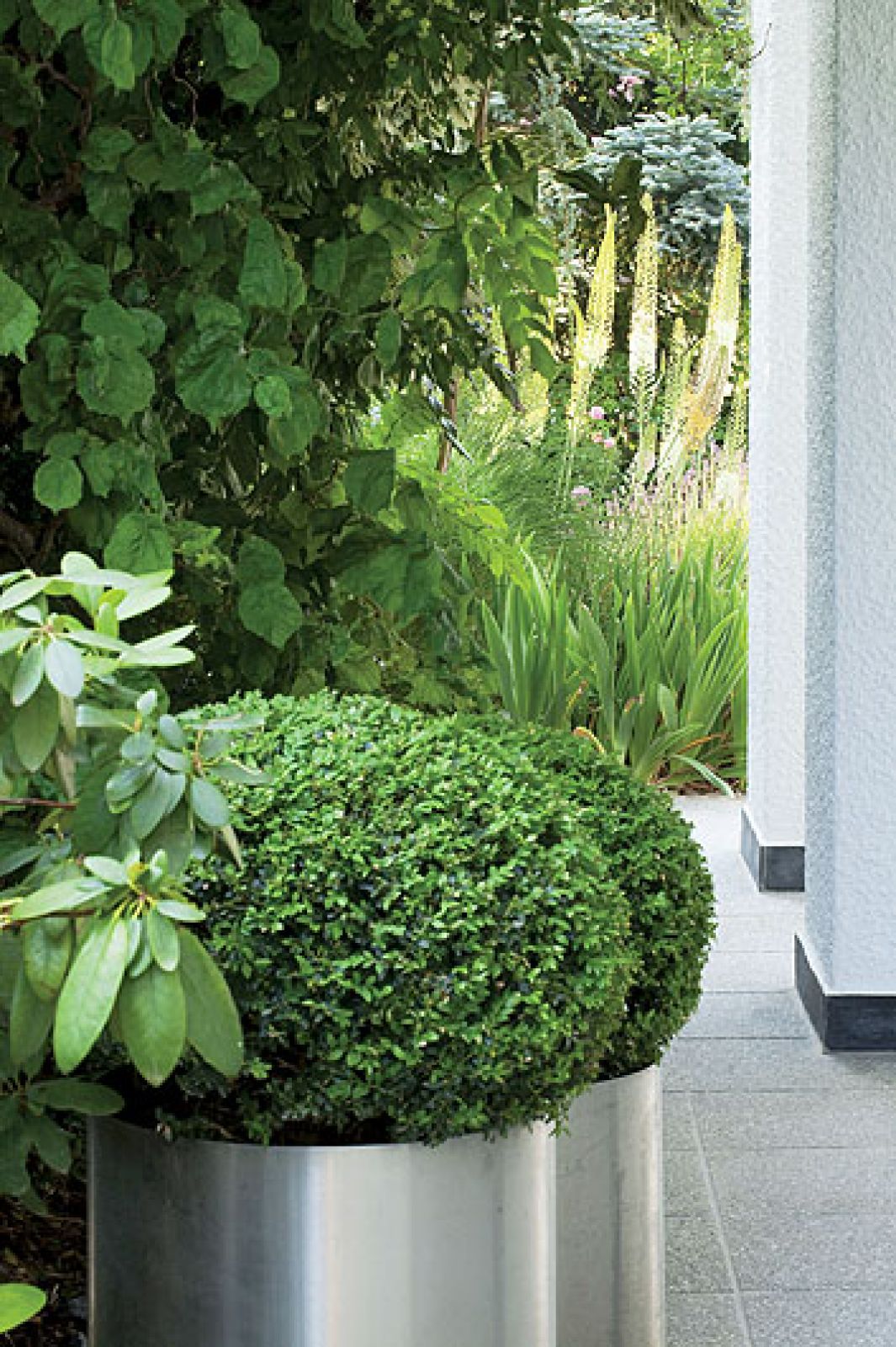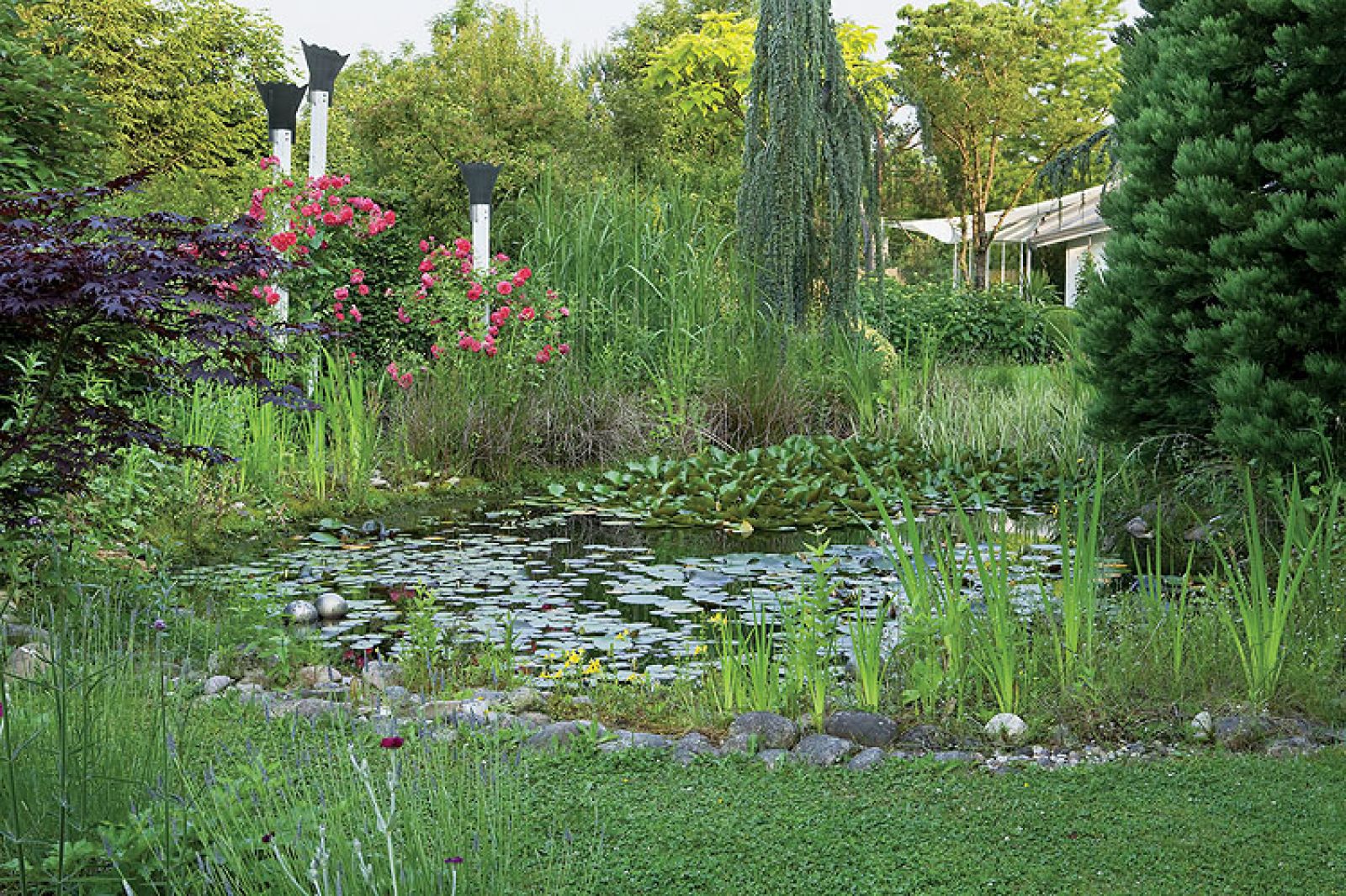 Granicę wyznacza śliwa wiśniowa i modrzew. Za nimi rozciąga się staw, a clou programu to rosnąca nieopodal gunnera brazylijska (wygląda jak gigantyczny rabarbar) i sekwoja olbrzymia. Do ogrodu idealnie dobrano małą architekturę. Tam, gdzie jest po miejsku, stoją chromowane fotele, a rabaty otoczone są stalowymi pierścieniami.