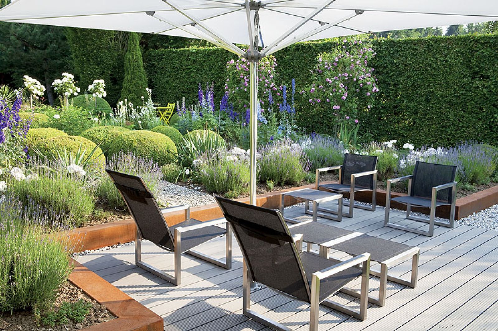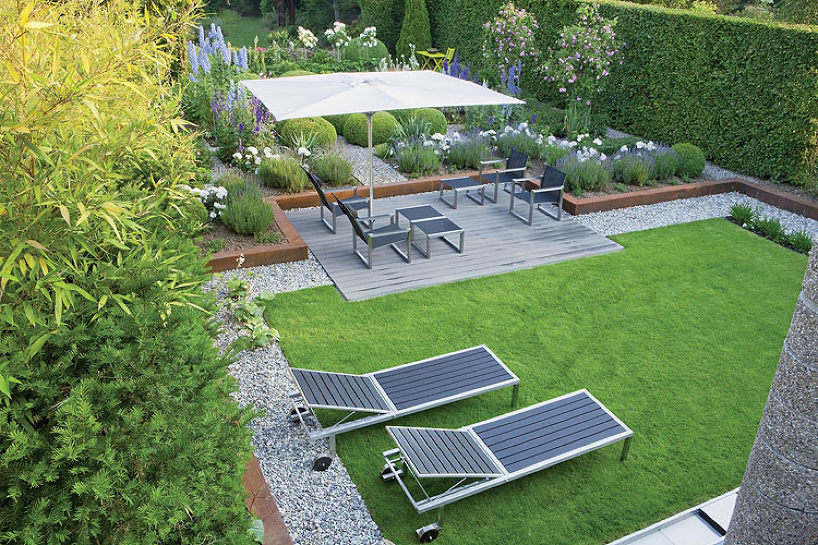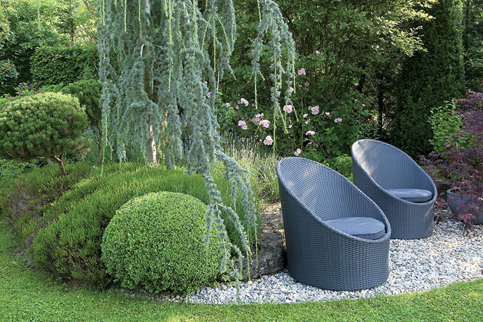 Granicę wyznacza śliwa wiśniowa i modrzew. Za nimi rozciąga się staw, a clou programu to rosnąca nieopodal gunnera brazylijska (wygląda jak gigantyczny rabarbar) i sekwoja olbrzymia. Do ogrodu idealnie dobrano małą architekturę. Tam, gdzie jest po miejsku, stoją chromowane fotele, a rabaty otoczone są stalowymi pierścieniami.