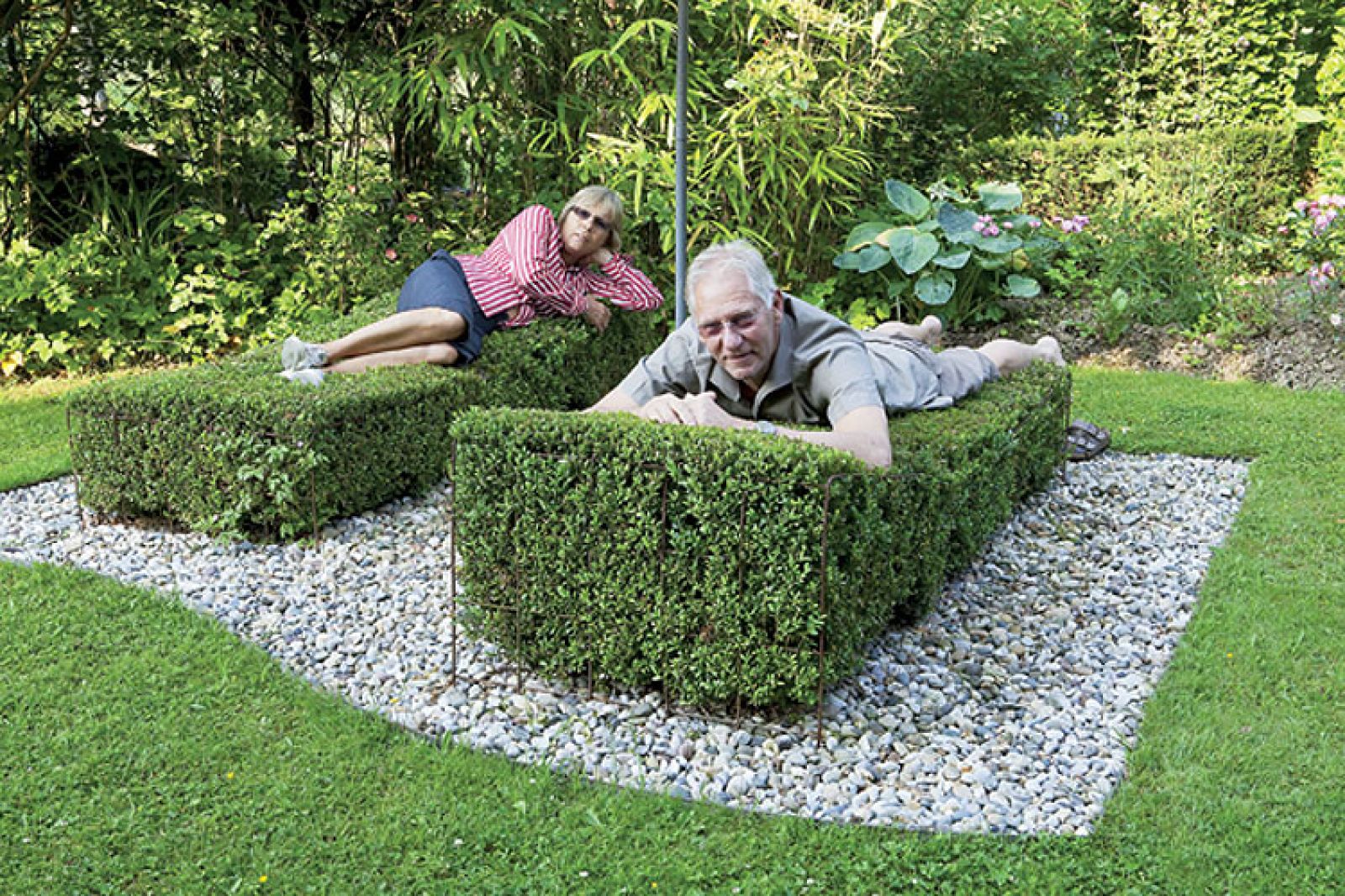 Dalej meble są już bardziej sielskie (przy różowej centifolii – żółty drewniany stolik z krzesłem), aż w końcu spośród drzew wyłaniają się wspomniane bukszpanowe leżaki – gęste krzewy uformowane tak, że spokojnie można się na nich położyć. René i Margot zrywają się, przepraszając, że nie przywitali mnie przy furtce – nie usłyszeli dzwonka. I zanim zdążę zadać pierwsze pytanie, jedno przez drugie zaczynają opowiadać o swojej dumie.