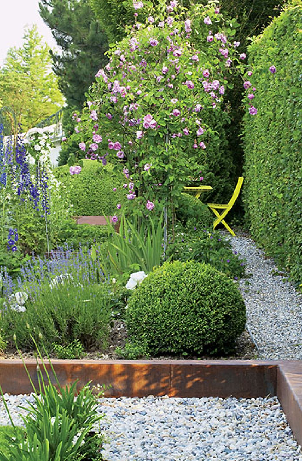 Ogród jest wąski i bardzo długi. Zaczyna się całkiem zwyczajnie, tak po miejsku: murawa, ścieżki wysypane żwirem lub wyłożone otoczakami, przycięte w kule bukszpany, barwne kępy ostróżek. Tu i ówdzie cenne gatunki róż: różowa centifolia 'La Noblesse’ (z jej płatków robi się perfumy i konfitury). Ale im dalej w głąb, tym więcej niespodzianek. Z prowadzonego pod linijkę ogród staje się dziki, nieokiełznany.