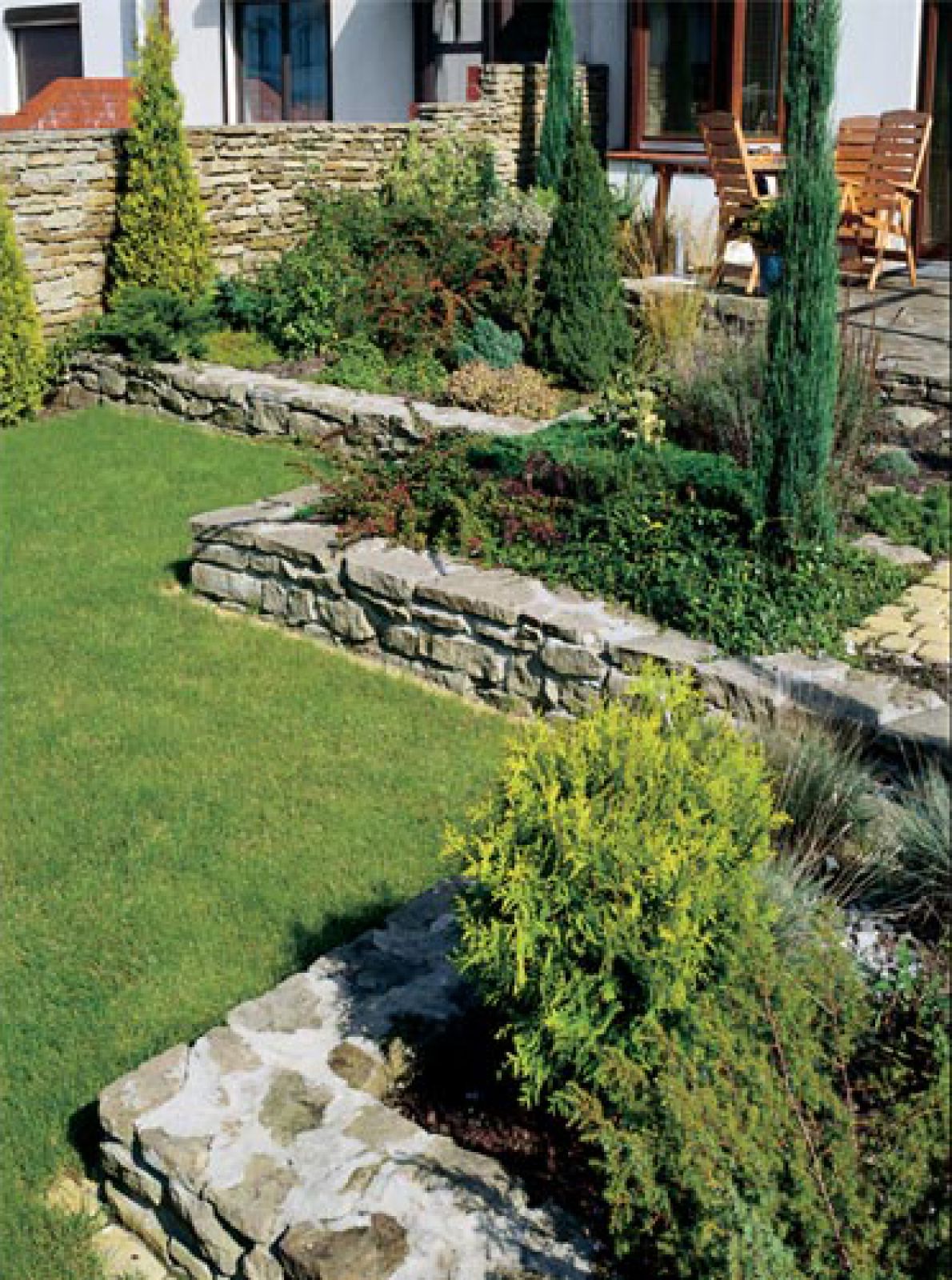 Państwo Węgrzynowie zrobili tuż przed wyjściem betonową, kwadratową wylewkę – miał tam powstać taras. Początkowo zbiło to z tropu projektantkę. Ale potem Ewa powtórzyła geometryczny kształt na kolejnych tarasach. Dwa, w najdalszych krańcach ogrodu, zostały wyłożone nieregularnymi płytami z piaskowca – tam można odpocząć, poopalać się lub zjeść kolację pod chmurką.