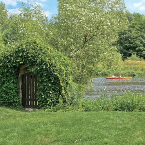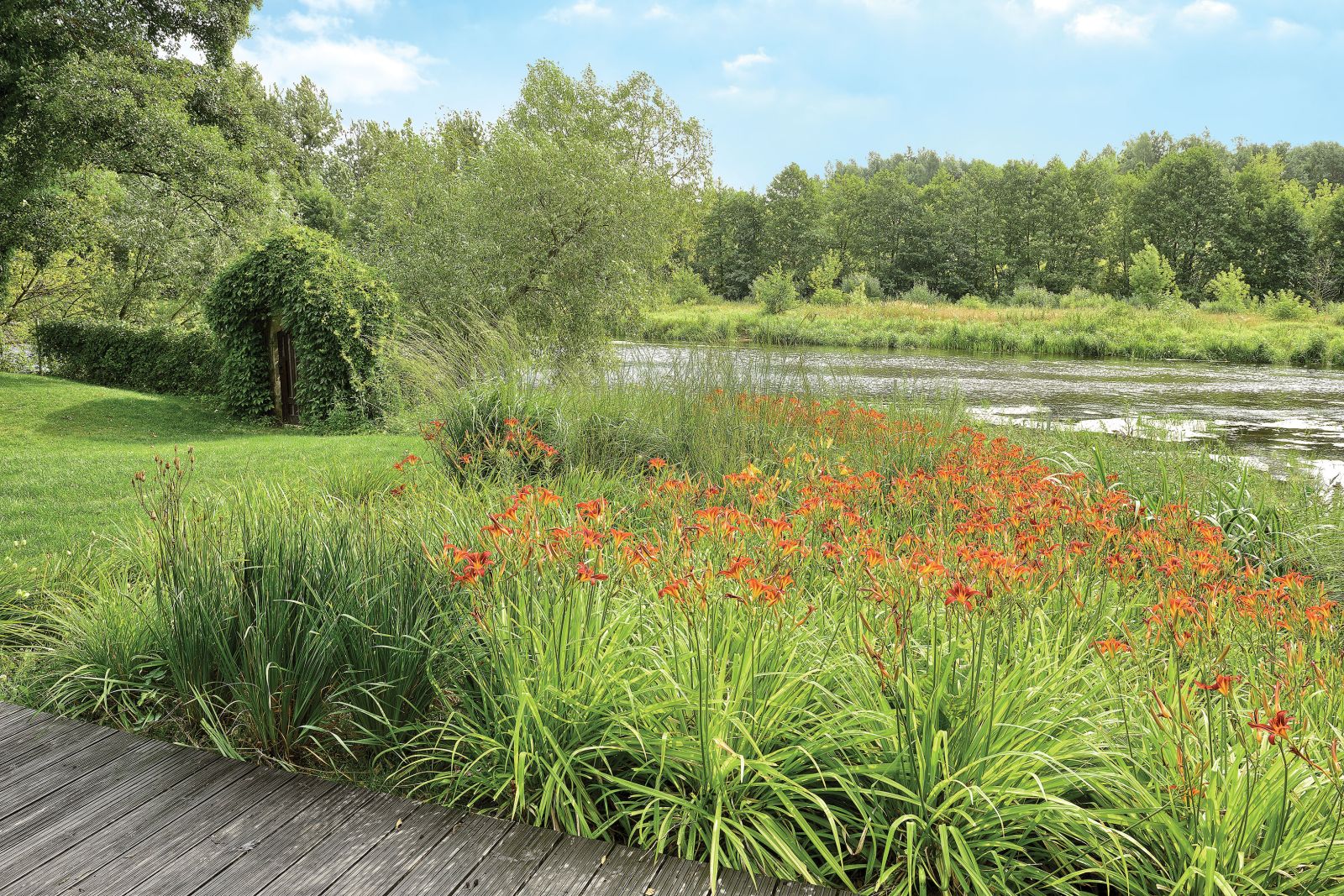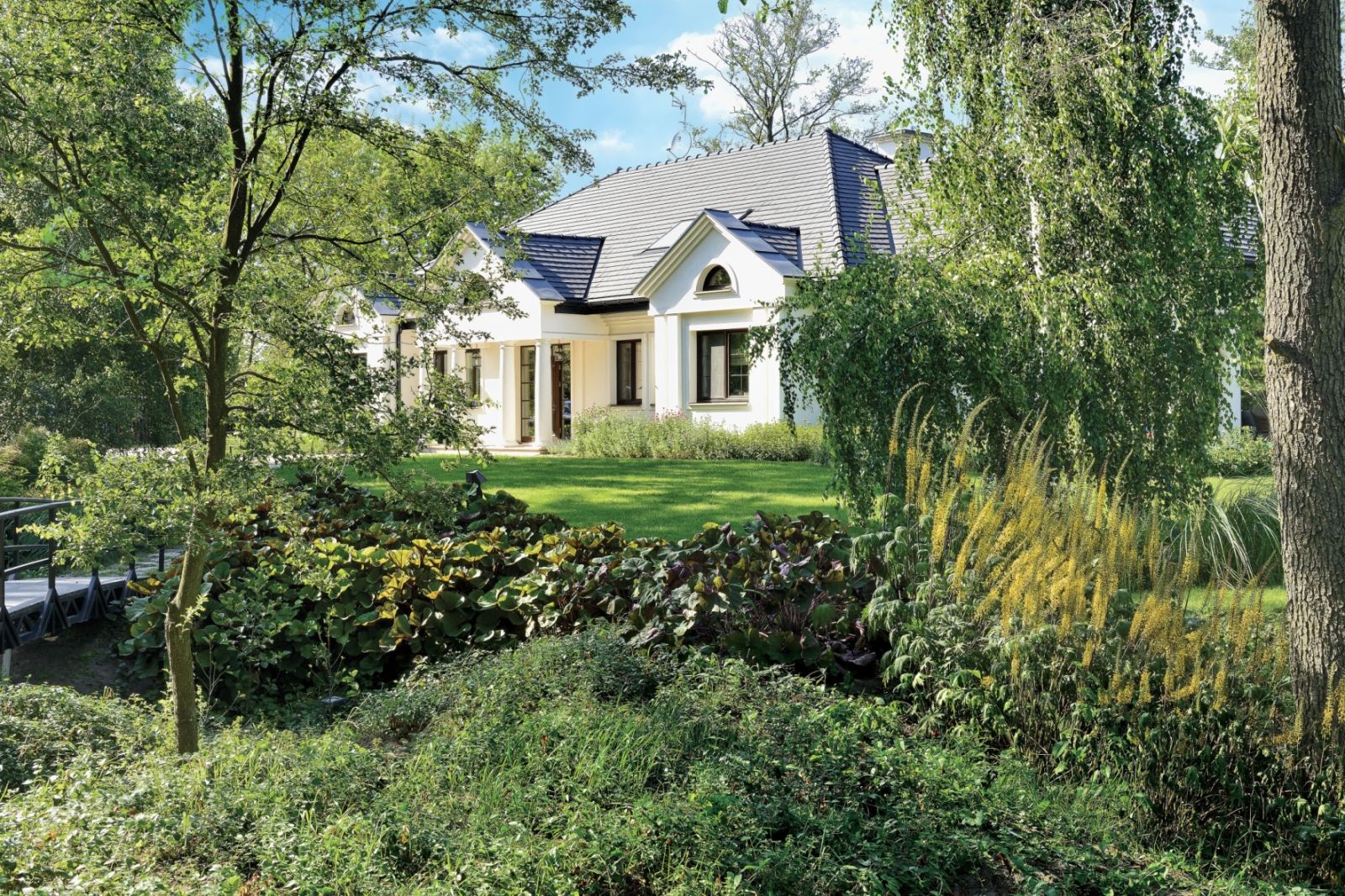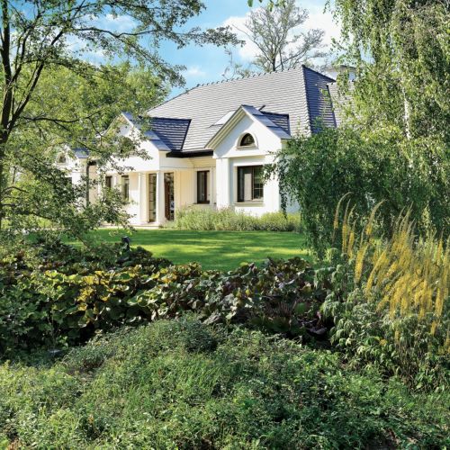 Marzeniem gospodarzy była ogłowiona wierzba, taka, jaką można jeszcze spotkać na miedzach. Kupili ją od znajomego rolnika za flaszkę i przewieźli ciągnikiem na działkę. Po lewej stronie, przy ścianie domu, rosną krzewy kalin, jaśminowców, bliżej rzeki – derenie. Zielone dywany tworzą bodziszki, paprocie, naparstnice, zawilce japońskie, hosty, konwalie. Albo kwitną na biało, albo mają biało-zielone liście.