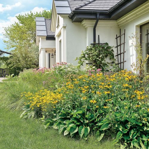 Projektanci zaproponowali rośliny, które zwykle widać w wiejskich ogrodach – w końcu to wieś, a dom Asi i Krzysztofa przypomina dworek, choć jest bardzo nowoczesny. Porobili z nich barwne kompozycje na klombach.
