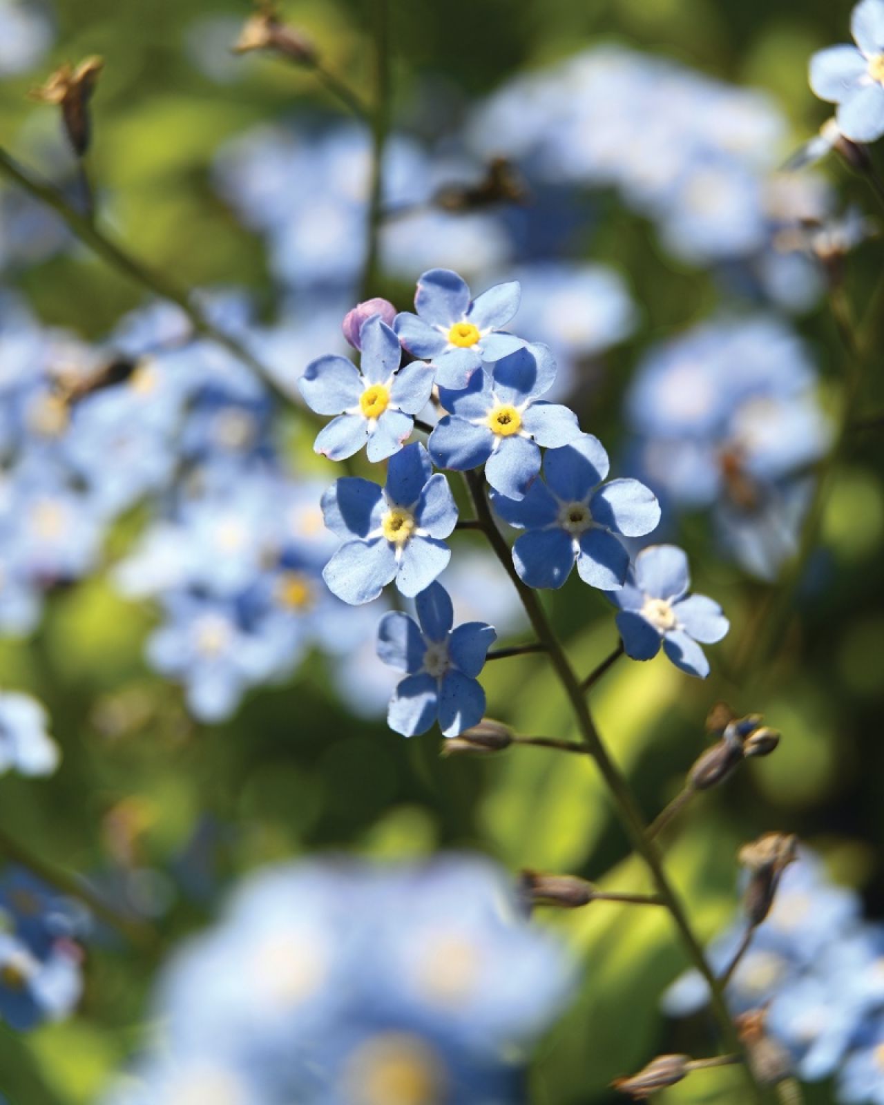 Niezapominajka błotna – pośród wszystkich niezapominajek ta dobrze radzi sobie w wilgotnej ziemi, o czym mówi jej nazwa gatunkowa. Dobrze wygląda na podmokłych łąkach, gdzie jej drobne kwiaty błyszczą jak topazy rozrzucone wśród źdźbeł wyższych traw. Łatwo się rozsiewa i radzi sobie sama, kwitnąc niezawodnie od wiosny do początku lata.