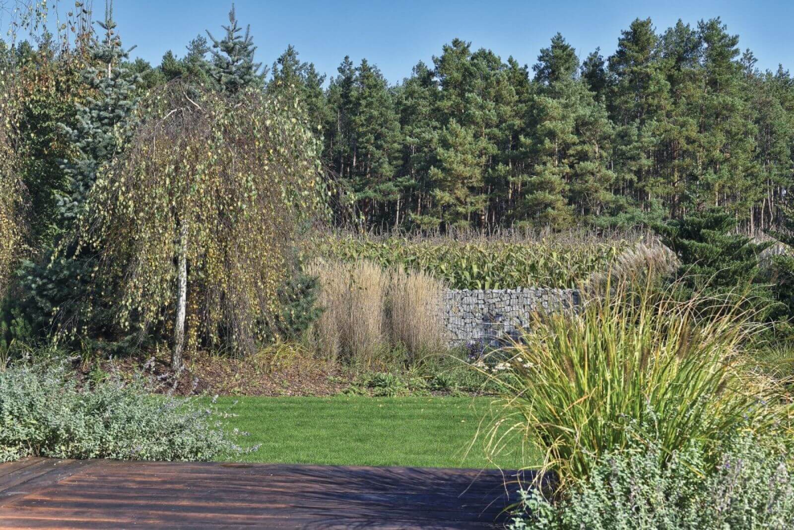 Zanim jednak do tego doszło, trzeba było doprowadzić do użytku cały teren – hektar łąki z niskim poziomem wód gruntowych i idącym przez działkę kanałem melioracyjnym. A przede wszystkim Rafał musiał spełnić najważniejsze życzenie właścicieli – malowniczo oddzielić ogród od widoku rosnących za płotami osiedli, a zarazem wizualnie wtopić go w dwie sąsiadujące z działką ściany lasu. Wiele ciężarówek ziemi zostało zamówionych, by podnieść teren. Powstał pomysł stworzenia gabionów zamiast tradycyjnego ogrodzenia, jak również utworzenia skarp, na których posadzono drzewa, aby stworzyć przyjazną, naturalną kurtynę zieleni dającą działce intymność.