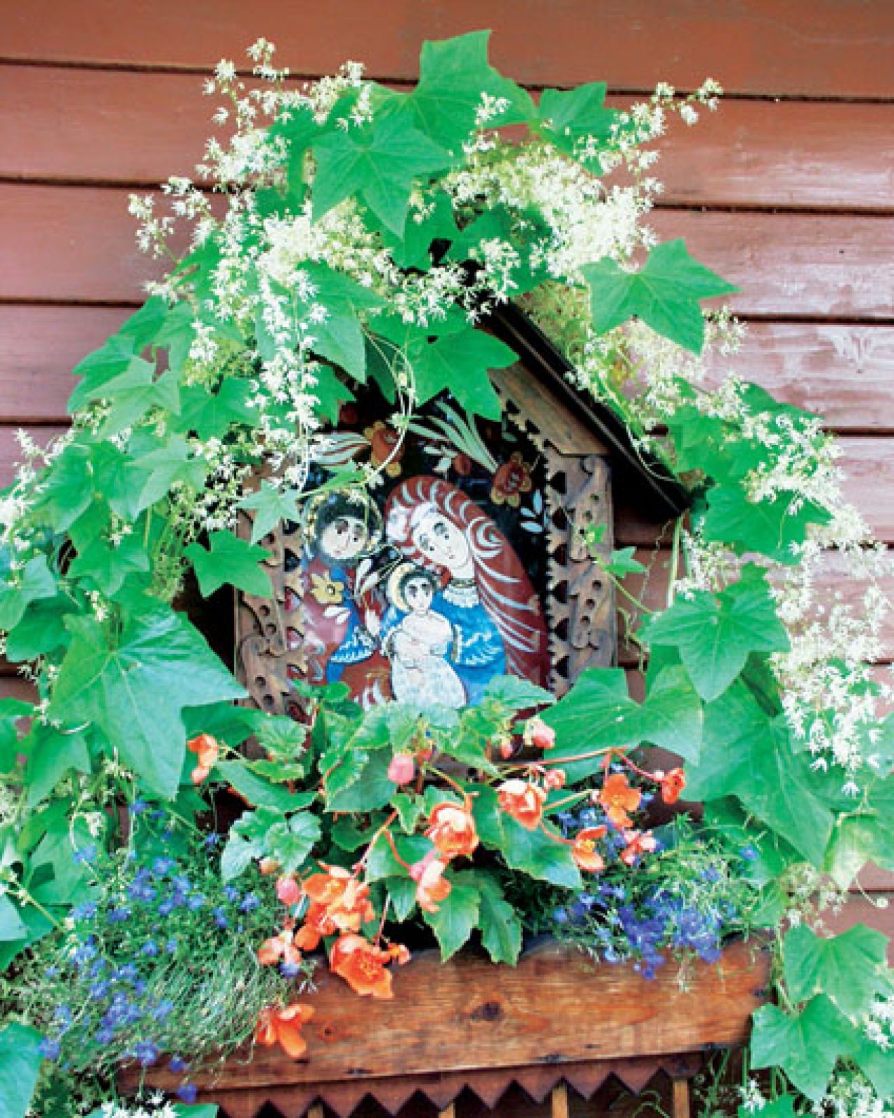 Pani domu jest znaną artystką ludową, ale jej głównym zajęciem jest ogród. Maluje w wolnych chwilach, między pieleniem a przesadzaniem, najczęściej wieczorem i w nocy, kiedy nikt i nic jej nie przeszkadza.