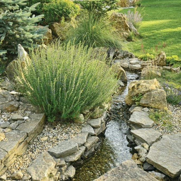 Ogród ze śródziemnomorskim skalniakiem i górskim potokiem