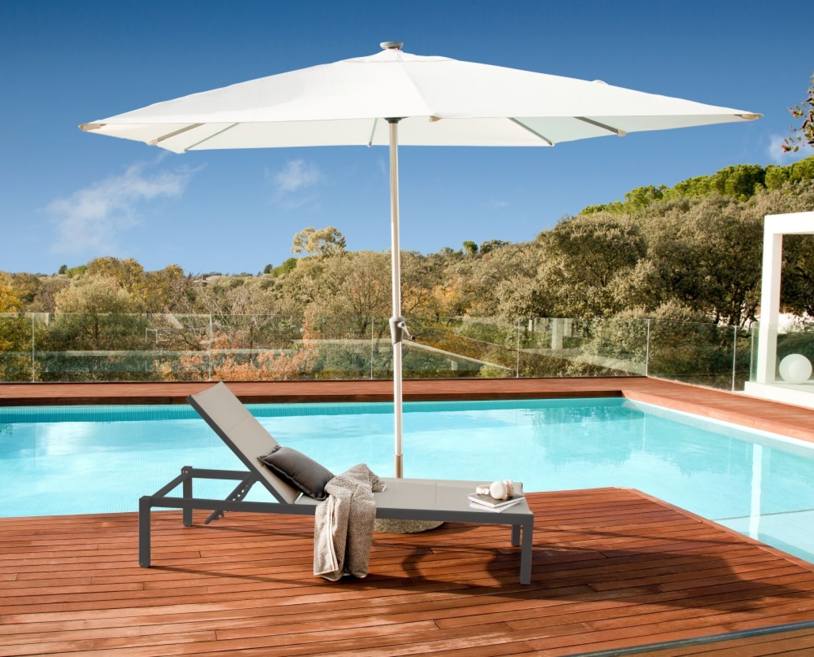 Ten parasol jest zrobiony z jasnego poliestru, który nie blaknie pod wpływem słońca. Ma regulowaną wysokość (od 110 d0 210 cm) i płaski daszek, który można powiększać od 180 cm do 210 cm. Taki parasol ogrodowy prostokątny można obracać o 180 stopni dopasowując regulację kąta nachylenia do pozycji, w jakiej znajduje się słońce. Jest to szczególnie przydatne rano lub późnym popołudniem.