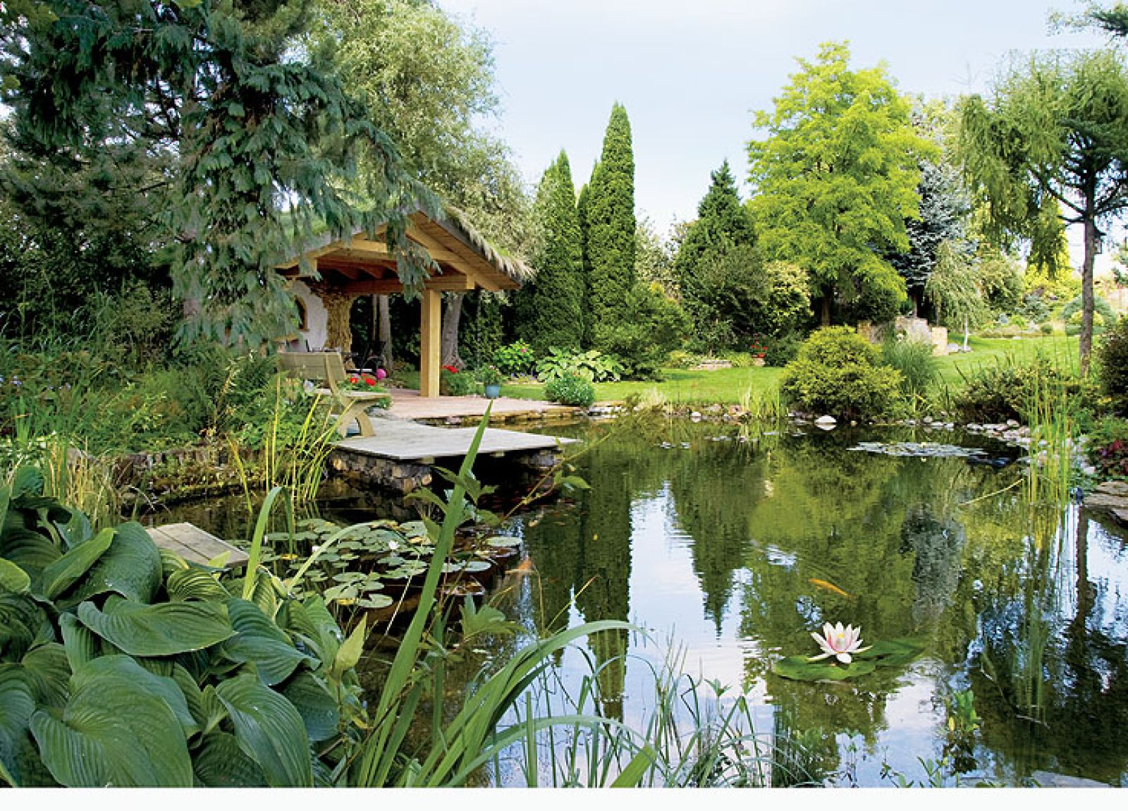 Najpierw można podumać nad strumykiem. Potem poczytać na ławce przy fontannie. A na koniec pooglądać karpie w stawie. Ten ogród jest jak park w miniaturze.