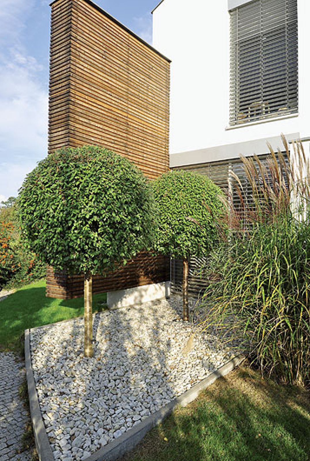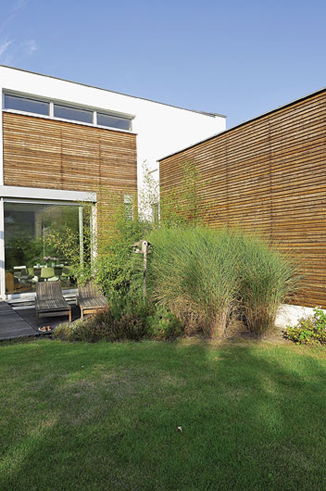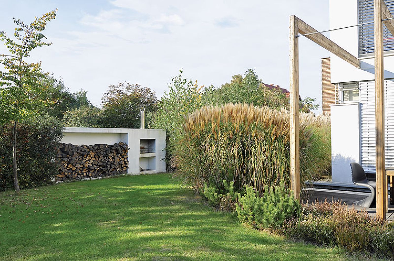 Ewa zaplanowała ogród, ale rośliny wybrał Ziemisław Burchard, znajomy projektant zieleni. To on polecił trawy – w tym bambusy. Posadził dwie wiśnie japońskie (kwitnące na biało), sześć platanów (te śródziemnomorskie delikatne drzewa z łaciatymi pniami dobrze zimują na cieplejszym Dolnym Śląsku) i żywopłot z dwóch odmian malowniczego ognika. Późną wiosną krzew obsypuje się białymi, drobnymi kwiatami, które pod koniec lata zamieniają się w pomarańczowe i czerwone kulki.