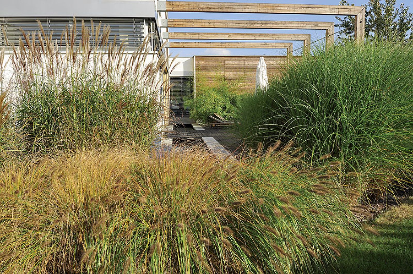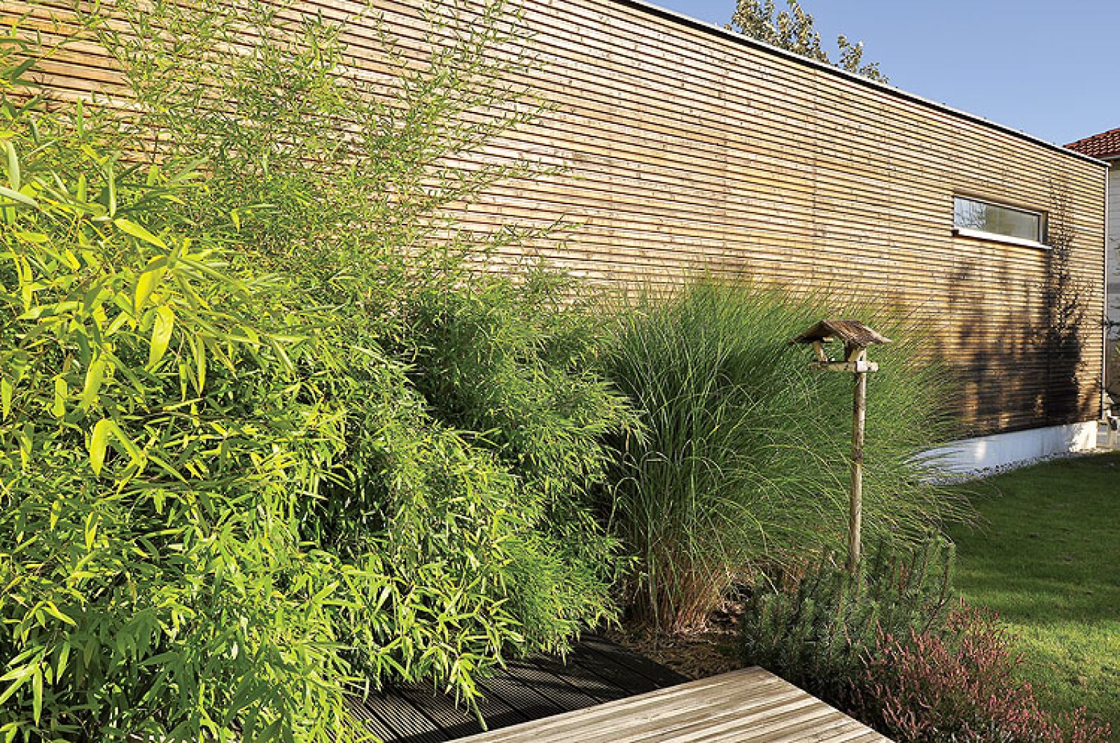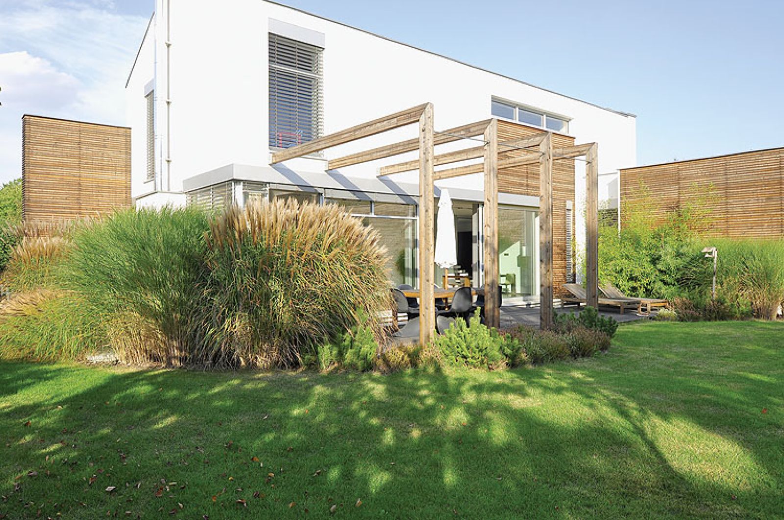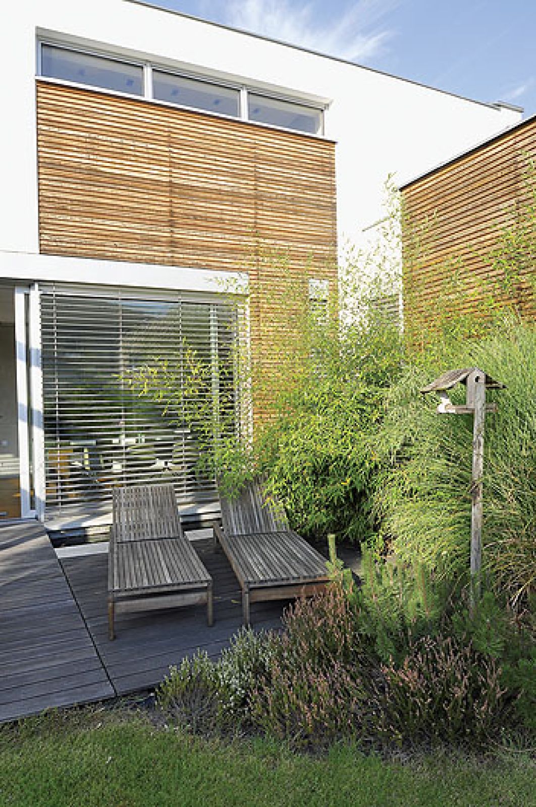 Ewa zaplanowała ogród, ale rośliny wybrał Ziemisław Burchard, znajomy projektant zieleni. To on polecił trawy – w tym bambusy. Posadził dwie wiśnie japońskie (kwitnące na biało), sześć platanów (te śródziemnomorskie delikatne drzewa z łaciatymi pniami dobrze zimują na cieplejszym Dolnym Śląsku) i żywopłot z dwóch odmian malowniczego ognika. Późną wiosną krzew obsypuje się białymi, drobnymi kwiatami, które pod koniec lata zamieniają się w pomarańczowe i czerwone kulki.