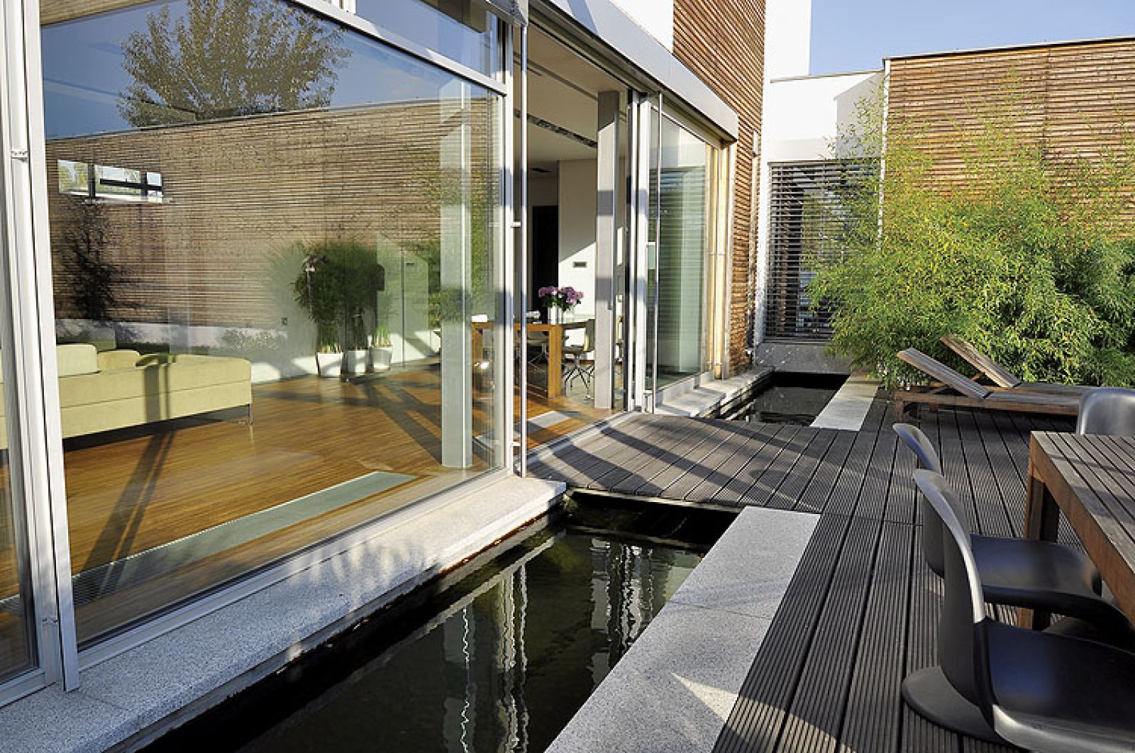 Nawet kiedy Ewa jest w domu, ogród ma w zasięgu ręki. Wystarczy, że odsunie trzymetrowe drzwi. Jeszcze zanim wyjdzie na drewniany taras, przechodzi po mostku, pod którym w betonowym korycie wyłożonym otoczakami płynie woda. Jeśli dzień jest słoneczny, mieni się i rzuca malownicze cienie na sufit w salonie. Wtedy łatwo sobie wyobrazić, że dom stoi gdzieś nad brzegiem jeziora.
