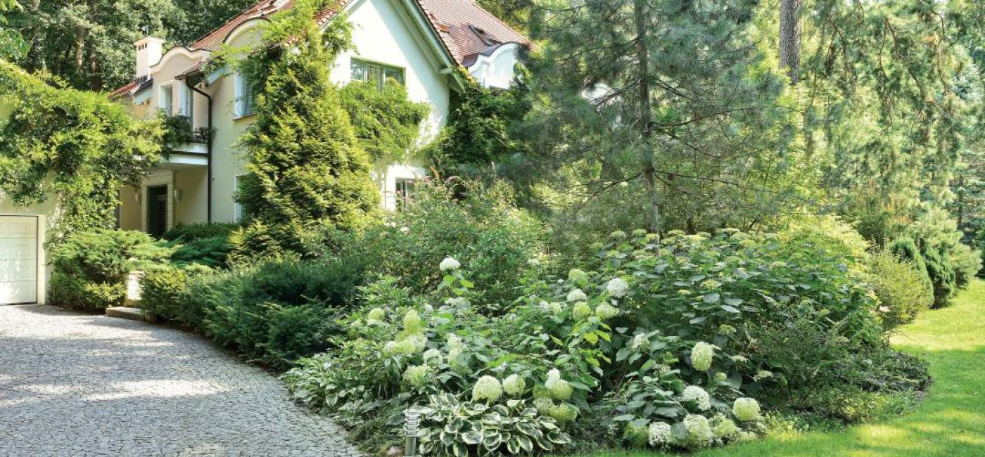 Wiekowe, bo 200-letnie sosny, dęby i graby rzucają głęboki cień, w którym chętnie pną się do góry lubiące trochę cienia hortensje, hosty i rododendrony.