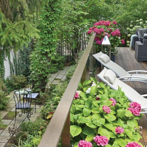 Na stworzenie tego wyjątkowego miejsca pozwoliła współpraca z pracownią Ogrodownia i architektami krajobrazu Agnieszką Duc i Mariuszem Paskiem. Skarpę w ogrodzie układali jak tort, przy okazji zakładając drenaż. Warstwy trzymają się na specjalnych, wypełnionych żyzną ziemią geokratach, które stabilizują konstrukcję. Jest teraz stroma, przypomina romantyczny wąwóz. – Porastają ją nieco mroczne paprocie, ostrokrzewy i wiele bylin żyjących w swoim własnym rytmie i niekoniecznie poddających się naszej woli – mówi pani Marta. – Ale już gdy po schodach wchodzimy na główny poziom ogrodu, spotykamy eleganckie miniaturowe bzy i hortensje, witające nas kwiatami i cudownym zapachem.