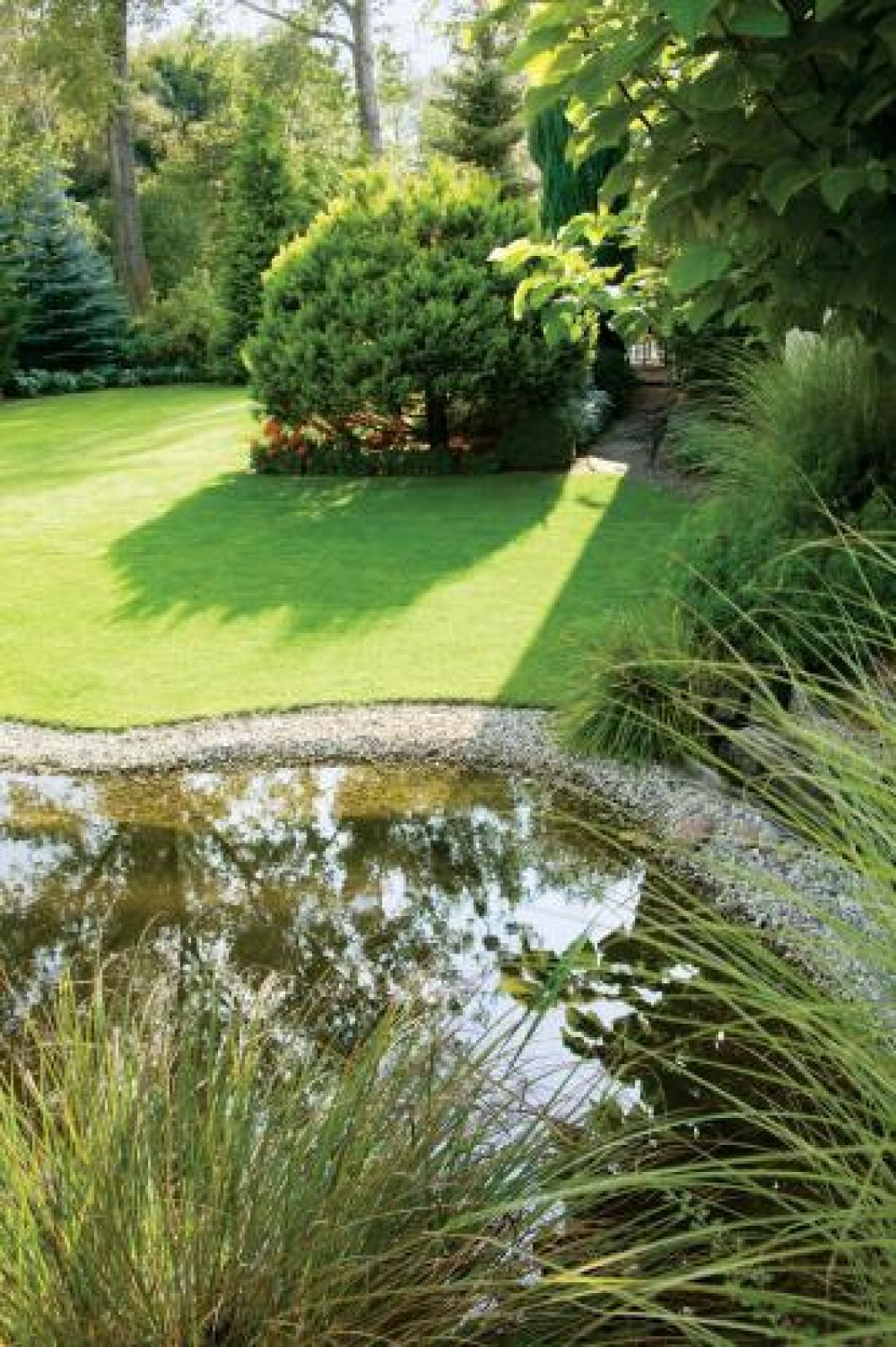 W ogrodzie dużo się dzieje – jest strumień i oczko wodne, rozległe trawniki, miejsce na ognisko, altana i trasy spacerowe do podziwiania tego wszystkiego. A naprawdę jest co podziwiać. Pod zwisającą koroną wiązu odmiany ʹCamperdowniiʹ powstała niespotykana altana. Na razie cienkie gałązki drzewa rozpięte są na konstrukcji z bambusowych pędów. Za kilka lat będzie tu dająca cień, gęsta pokrywa z liści. Pod ogromnym parasolem już teraz czeka na gości ławka w stylu angielskim wykonana przez zaprzyjaźnionego stolarza.