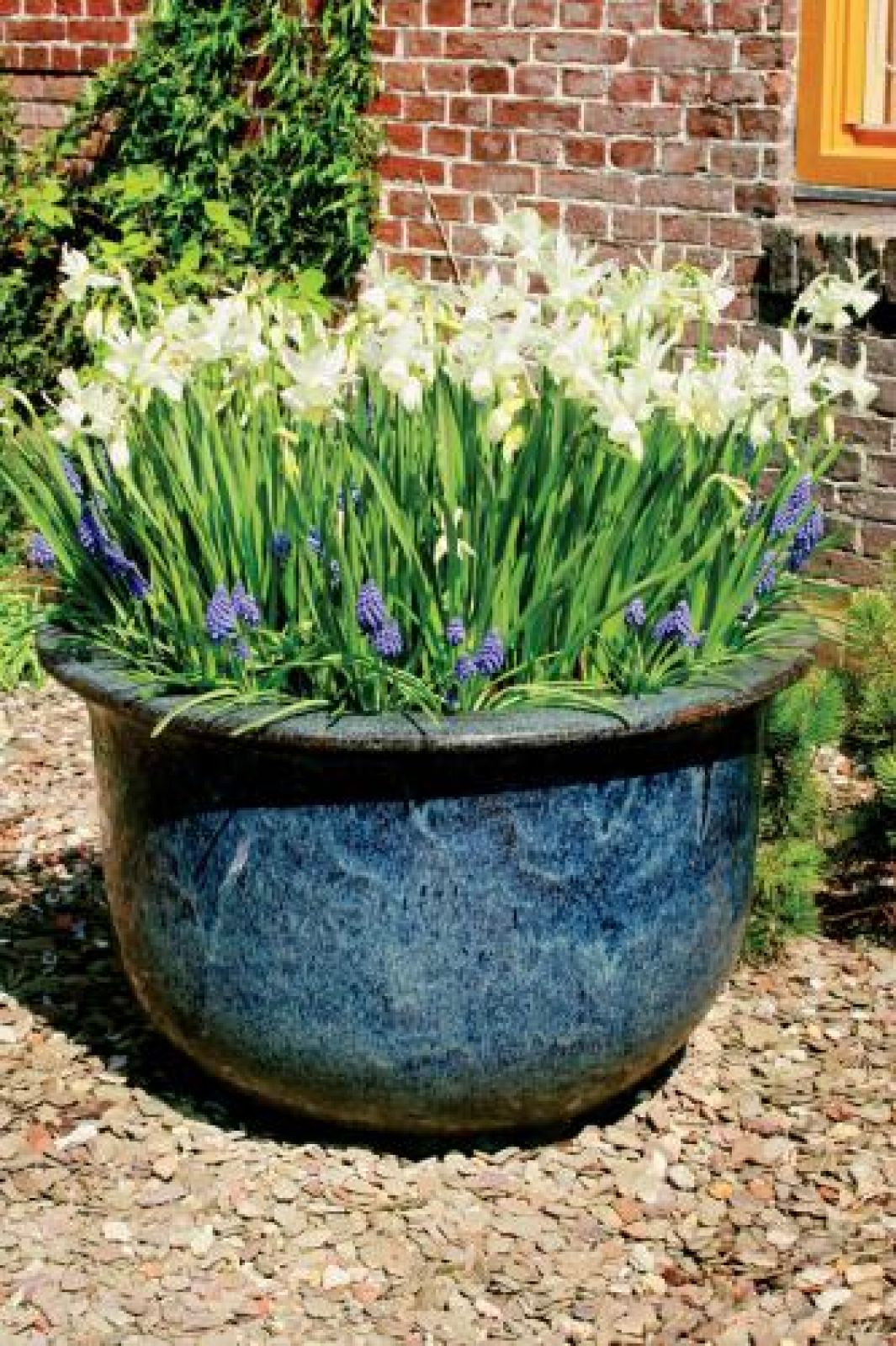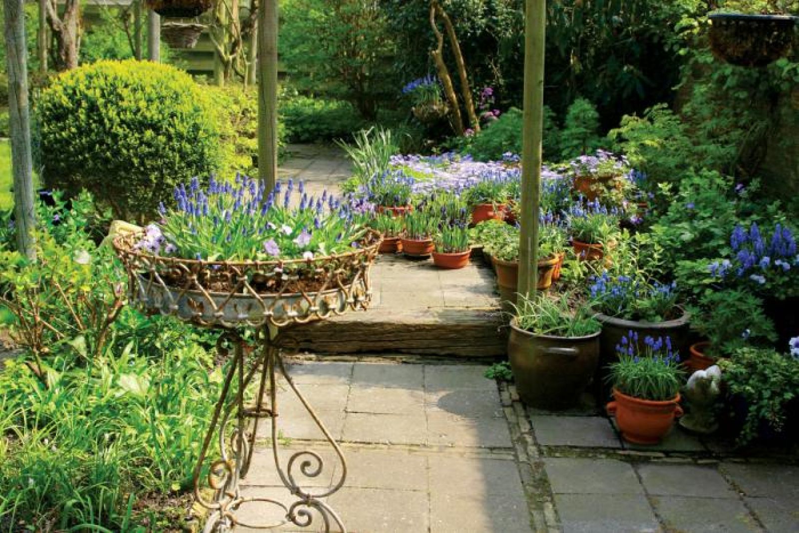Zachwycające bukiety Anna sadzi nie tylko w donicach, ale i starych konewkach, misach czy drewnianych skrzyniach. Moje ulubione miniaturowe żonkile rosną w tym roku w starym durszlaku, a błękitne szafirki armeńskie w kwietniku z wiekowego metalowego stolika.