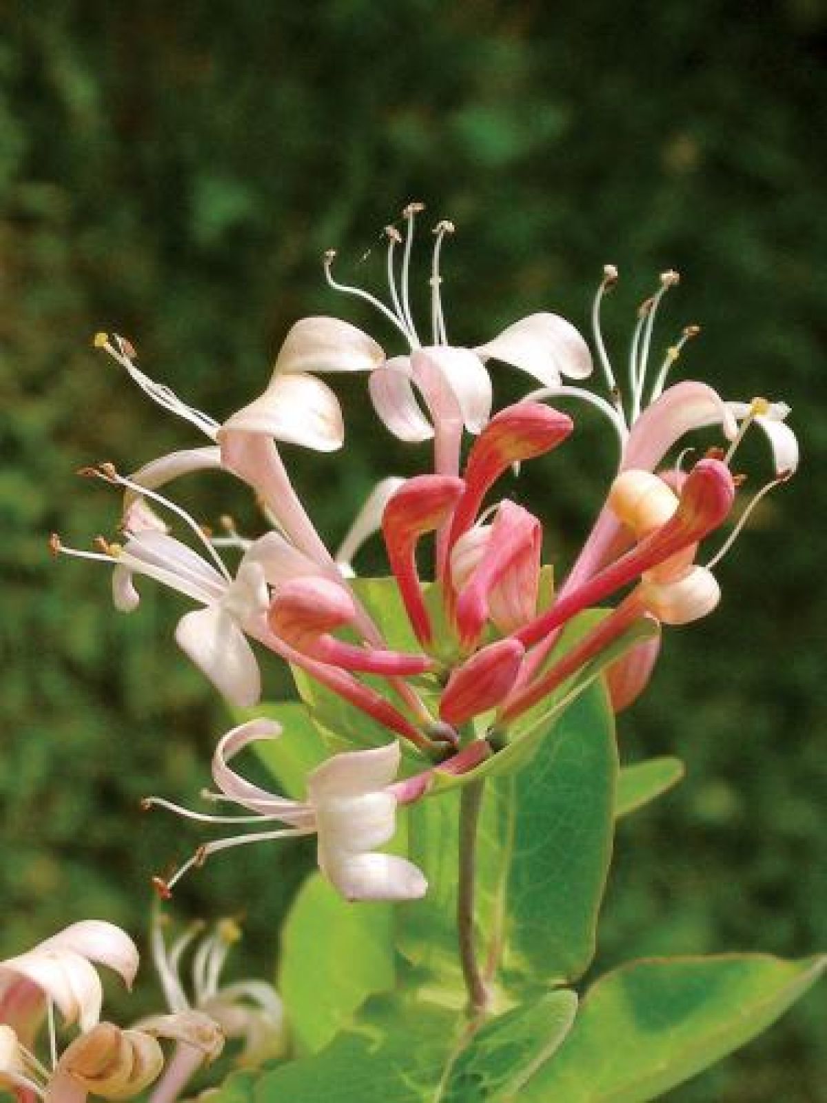 wiecznie zielony (L. sempervirens), kwiaty miedzianożółte, owoce pomarańczowe, zimozielone liście