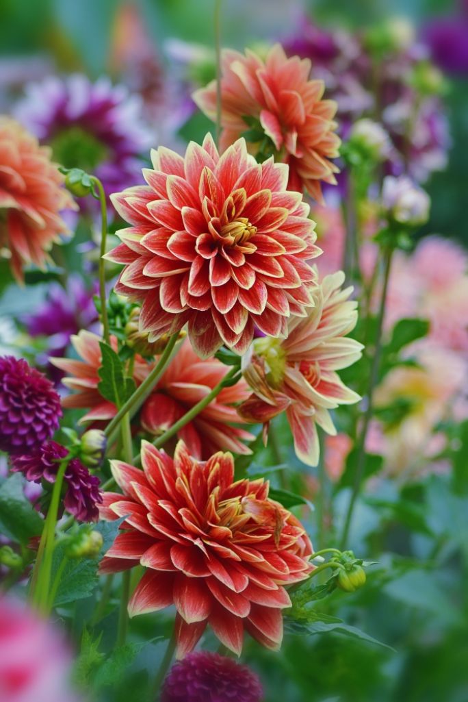 Ale przede wszystkim kwiaty należy sadzić piętrowo: wysokie z tyłu, niskie z przodu. Na przykład dalie sięgające ok. 100 cm wysokości, będą stanowiły piękne tło dla innych, niższych roślin. Dalie lubią słoneczne stanowiska, dlatego dobrze będą się czuły w sąsiedztwie astrów np. novae-angliae czy chryzantem lub ozdobnych traw, które również są wysokie (te ostanie latem tworzą jedynie zielony drugi plan dla kwitnących roślin, jesienią zaś grają główną rolę).