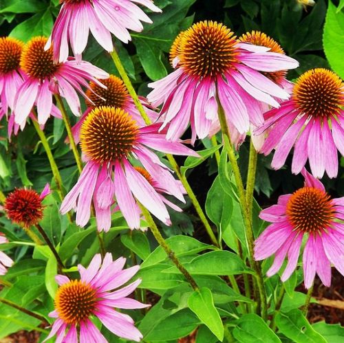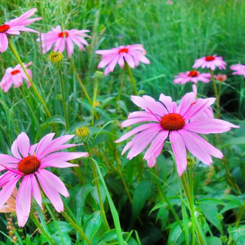 Echinacea purpurea (1-1,5 m). U typowej odmiany kwiaty są purpurowe, a środki brązowo-pomarańczowe. U odmian hodowlanych występują różne kwiaty – pojedyncze i pełne.