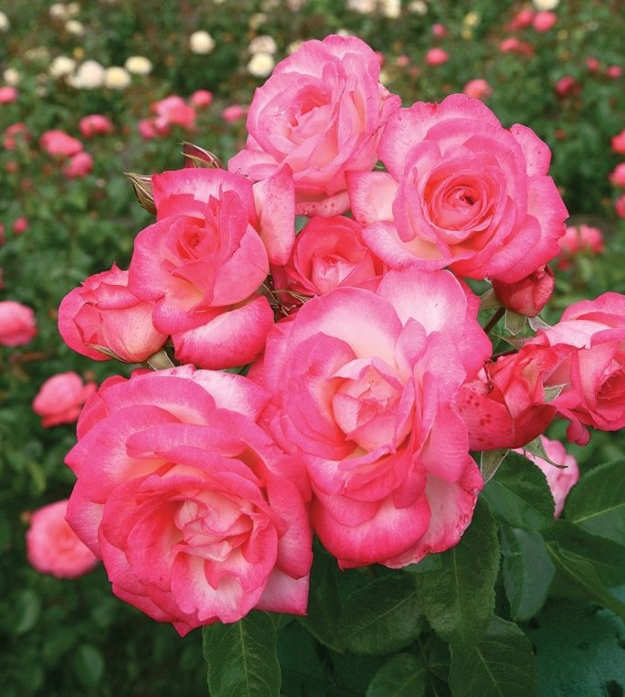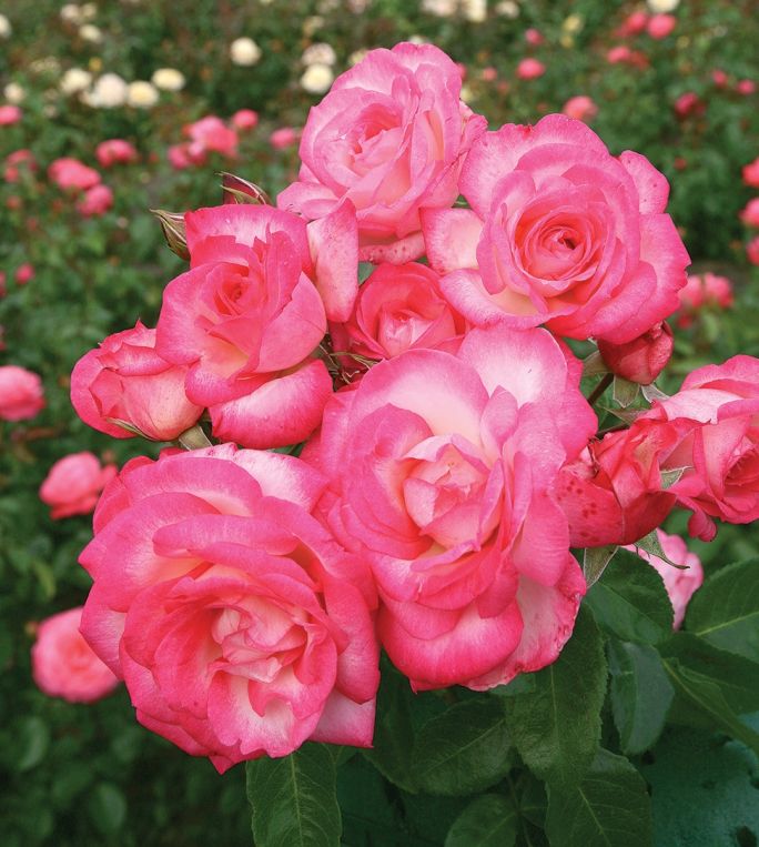 ’PEACH MELBA’ – wspaniała odmiana do niewielkich ogrodów albo na taras czy balkon, ponieważ można ją posadzić nawet w donicy. Należy do róż o umiarkowanym wigorze (dorasta do 2 m wysokości). Bardzo obficie obsypuje się kwiatami (powtarza kwitnienie) o delikatnym zapachu i oryginalnej barwie. Płatki to prawdziwa gra kolorów: żółtopomarańczowego z różowołososiowymi akcentami. Pięknie wygląda na tle ciemnozielonych lśniących liści.