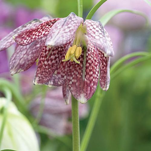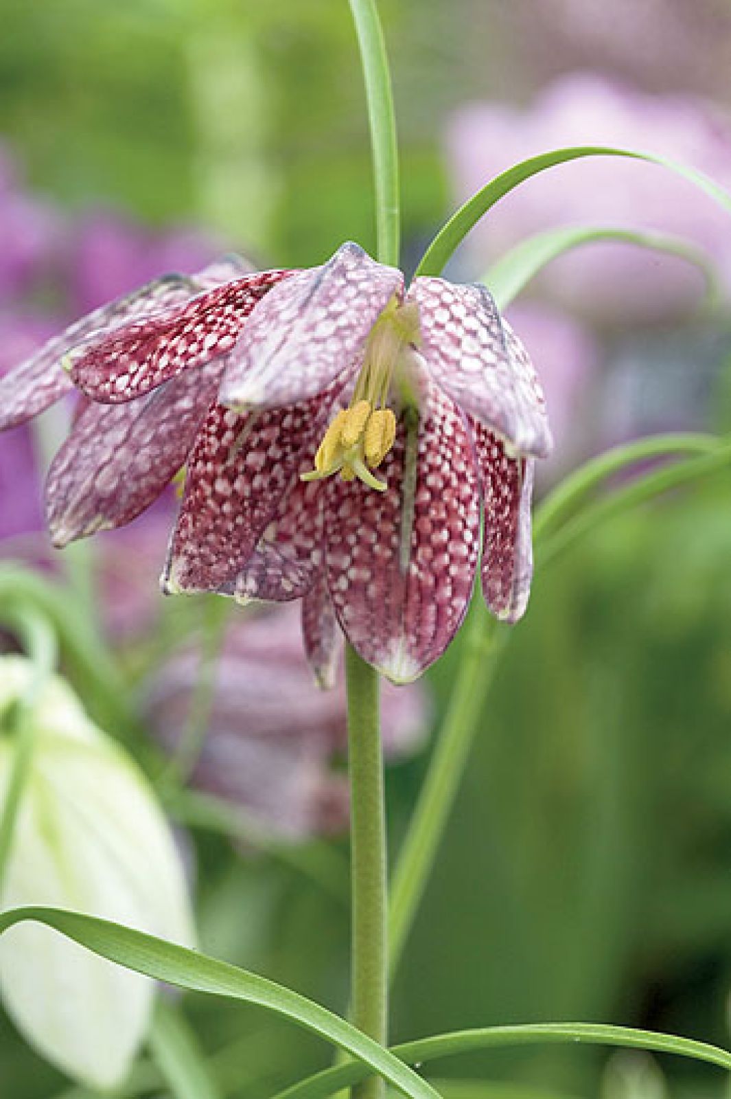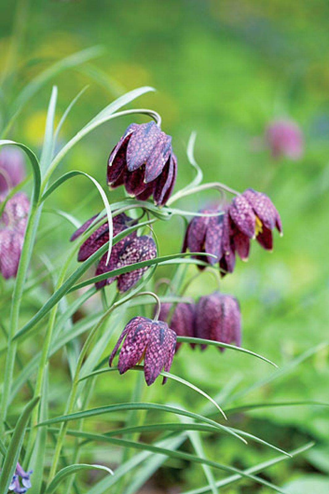 Pierwsza pojawia się szachownica kostkowata (Fritillaria meleagris) – oryginalna i subtelna. Kwitnie w kwietniu i maju. Przypomina tulipan, ale główka opada jej jak u dzwonków i ma na płatkach wzór kratki, od której wzięła się polska nazwa całej rodziny (chociaż inne szachownice są gładkie). Kwiaty – purpurowe, różowe, kremowobiałe. Dorasta do 40 cm i ładnie wygląda wśród traw.