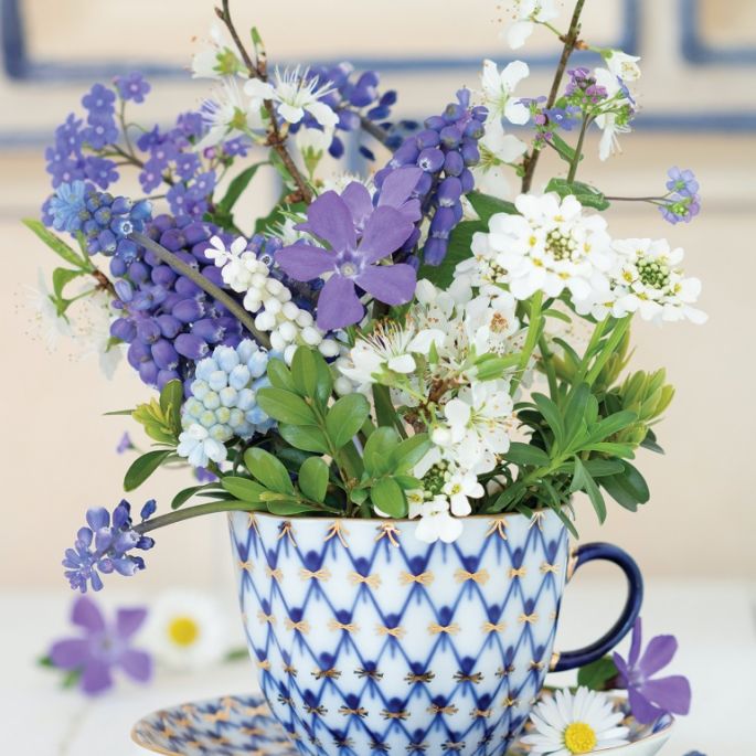 Kwitnące szafirki to znak, że zima za nami. Zróbmy z nich bukiet z innymi wiosennymi kwiatami – gałązkami kwitnącej jabłoni, białymi narcyzami i hiacyntami albo uplećmy wianek z gałązkami bukszpanu.