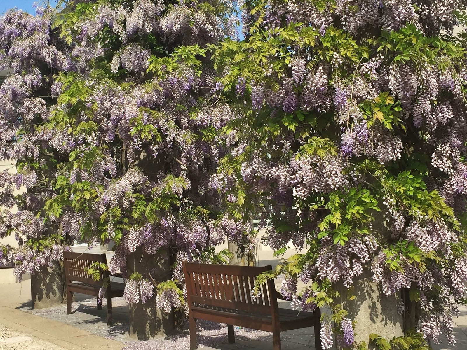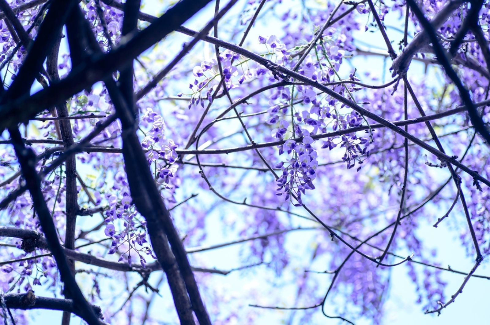 Wisteria (glicynia) – przepięknie kwitnące pnącze, które w maju obsypuje się kwitami i wygląda jak liliowy deszcz