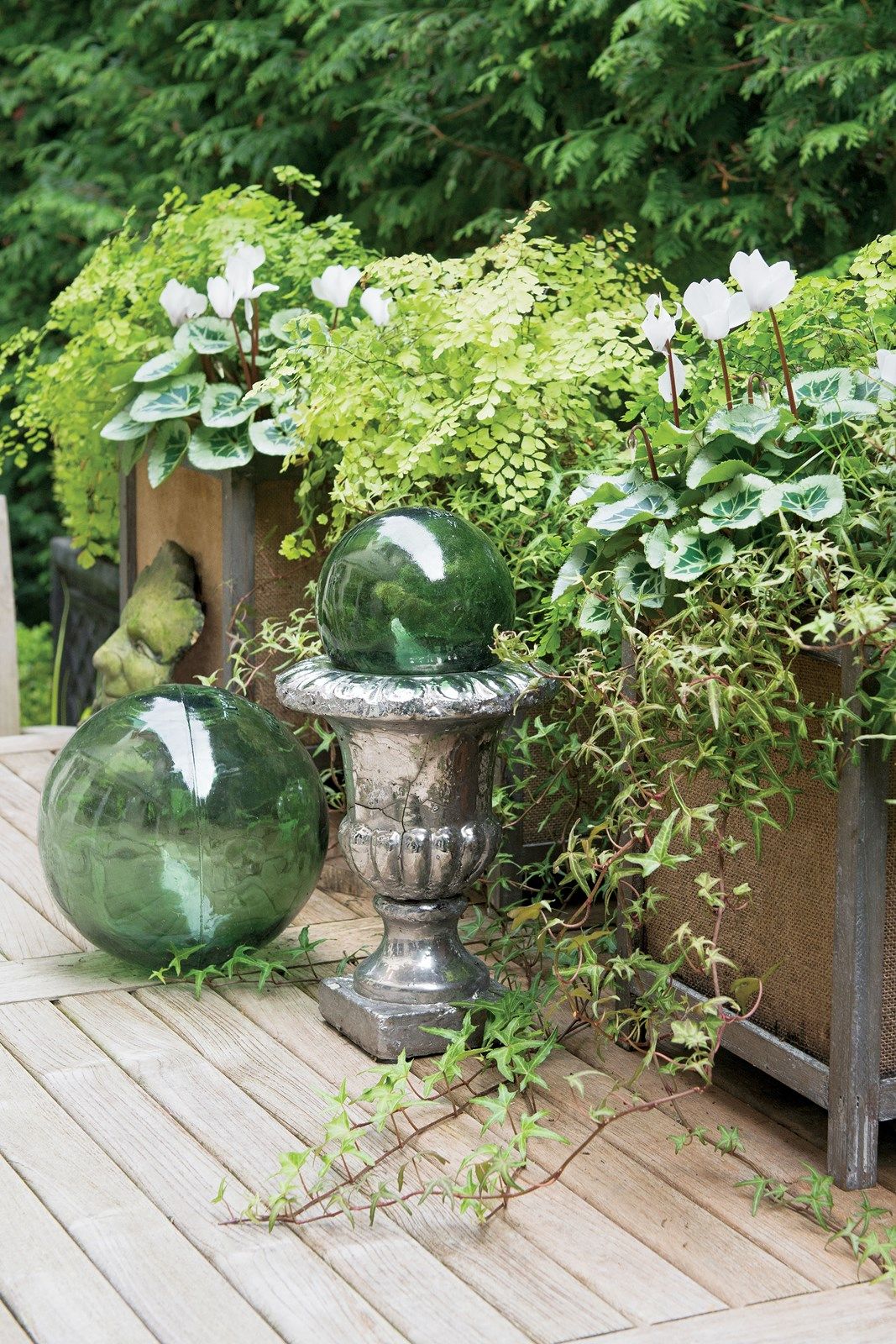 Dla urozmaicenia wśród masy zielonych liści warto ustawić coś o zupełnie innej fakturze. Przedmioty szklane, błyszczące, lustra, kamienne obeliski, figury, amfory. Ustawione pionowo lustrzane tafle mają tę zaletę, że dzięki nim ogrody wyglądają na większe.