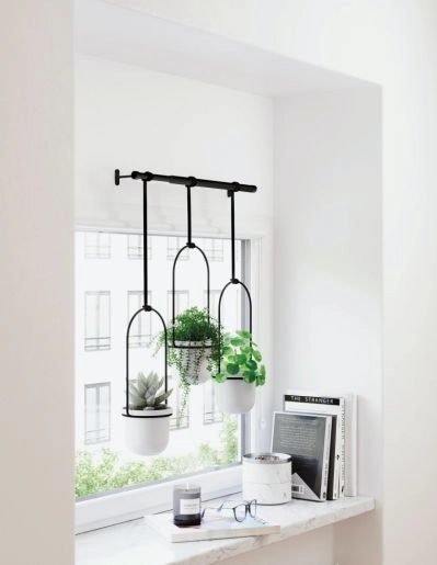 Zdjęcie główne: Wisząca lampa-kwietnik Lank, vox.pl, niżej: Pojemniki ścienne Floralink, Umbra, fabrykaform.pl