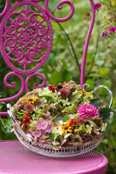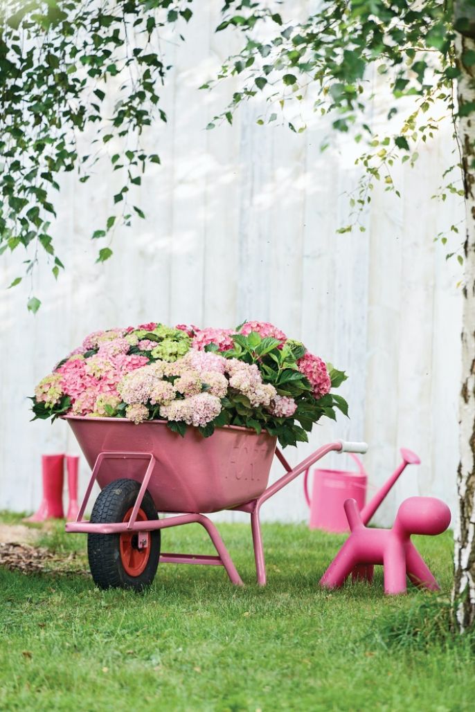 Hortensje na tarasie prezentują się wspaniale. I wcale nie muszą stać w donicach. Dla urozmaicenia umieść je w wiklinowych koszach albo włóż do kolorowej taczki – efekt będzie jeszcze lepszy, gdy dobierzesz kwiaty oraz dekoracje w tej samej tonacji. Zamiast wstawiać bukiet do wazonu wykorzystaj akcesoria ogrodnicze i włóż kwiaty do… konewki. Nietypowa dekoracja ogrodowa gotowa.
