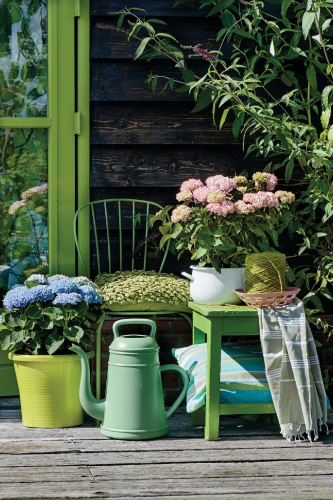 Stwórz przed domem kącik relaksu w zieleni. Wystarczą zwykły stolik, krzesło i donice z hortensjami. Dbaj o nie tak samo jak o te na ogrodowych rabatach. Pamiętaj, żeby często je podlewać, ziemia musi być lekko wilgotna, ale nie mokra. Kwiaty wolą półcień od palącego słońca. Odpowiednio pielęgnowane i nawożone raz w tygodniu, hortensje w donicach będą ozdobą tarasu aż do jesieni!
