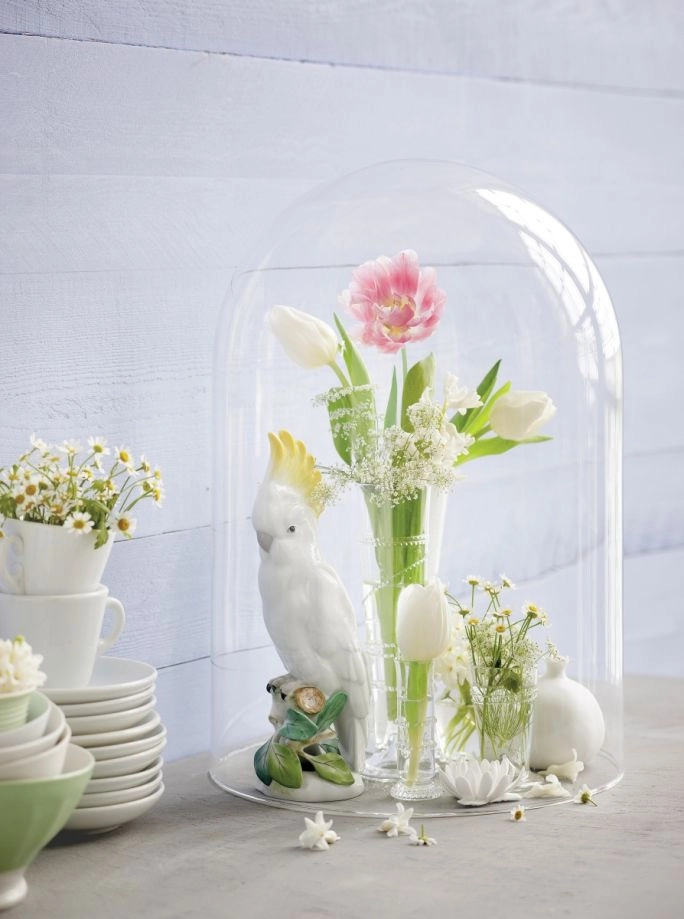 Tulipany są wiotkie, więc możesz je połączyć z usztywniającymi bukiet gałązkami wierzby, forsycji lub baziami. Gdy kilka z nich obwiążesz sznurkiem lub wstążką, też będą trzymały się pionu. Gdy przykryjesz je kloszem, powstanie elegancka martwa natura, która udekoruje wnętrze.